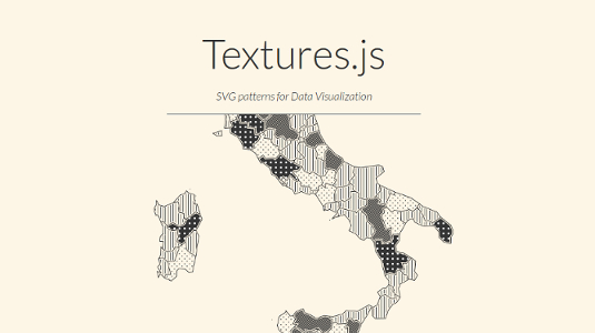 Đứng top trong số các công cụ d3.js, Textures.js được thiết kế nên bởi nhà dữ liệu học Riccardo Scalco. Textures.js được xem là một thư viện tiện dụng để tạo ra các kết cấu SVG cho việc thiết lập hình ảnh từ dữ liệu của bạn. Khi sử dụng công cụ này, website của bạn sẽ có được bảng hướng dẫn sử dụng, kết hợp các dòng chữ ,dấu chấm và hình dạng khác nhau cũng như tạo ra các mẫu tùy chỉnh của riêng bạn. Nó được cài đặt chung với phần mềm Bower và NPM.