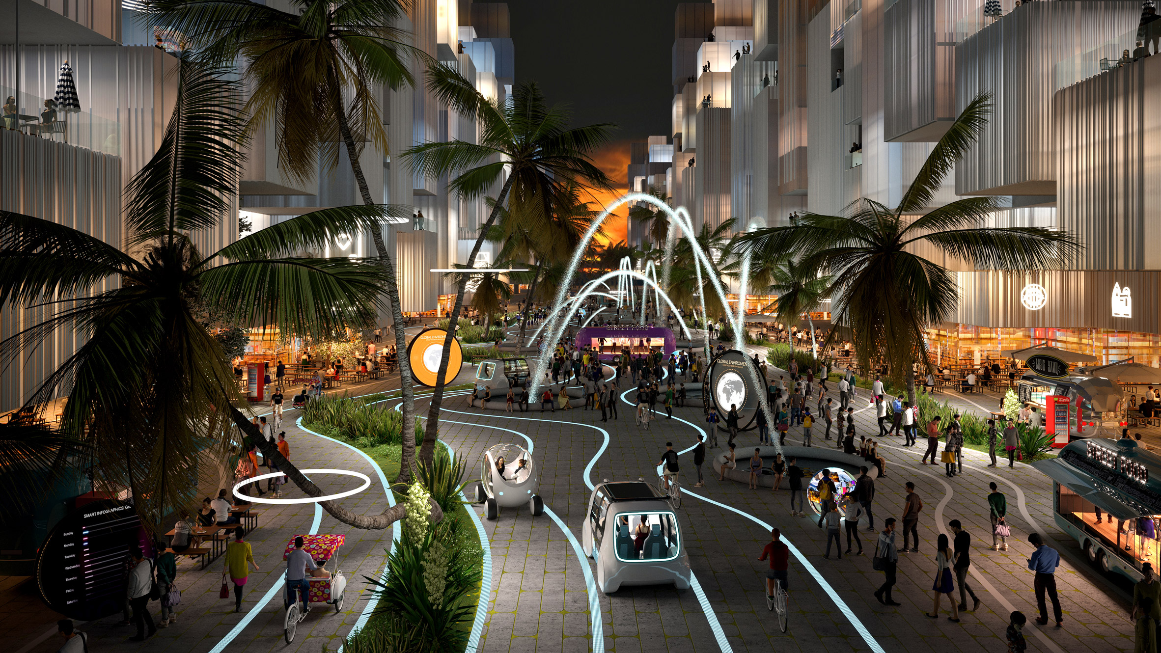 Mỗi hòn đảo có thiết kế giống hoa lily được dự kiến có thể làm nơi cư trú cho 15.000 đến 18.000 cư dân và được kết nối bởi một mạng lưới giao thông tự hành không có ô tô.