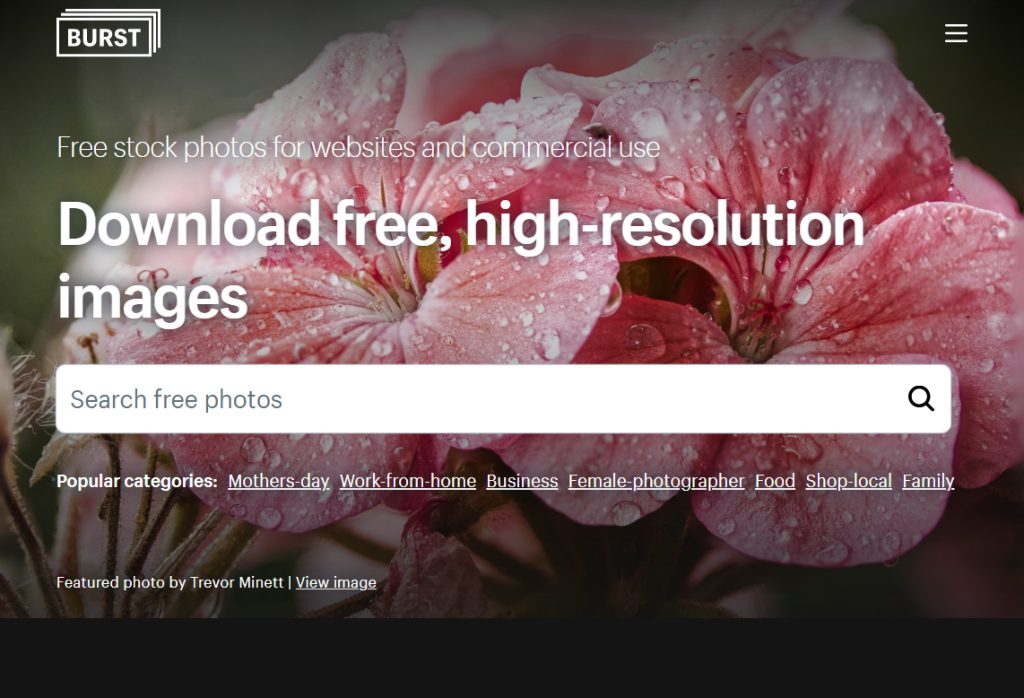 Burst là một nền tảng kho ảnh miễn phí được cung cấp bởi Shopify. Các nhiếp ảnh gia của họ liên tục chụp và tải lên các hình ảnh có độ phân giải cao để giúp người dùng tìm thấy kho tài nguyên miễn phí hoàn hảo cho dự án tiếp theo của họ. Mục tiêu của Burst.Shopify là xây dựng thư viện hình ảnh miễn phí tốt nhất cho các nhà kinh doanh, vì vậy, chúng họ liên tục tải lên ảnh mới và thêm các danh mục mới để phản ánh xu hướng hiện tại trong thương mại điện tử và bán lẻ.
