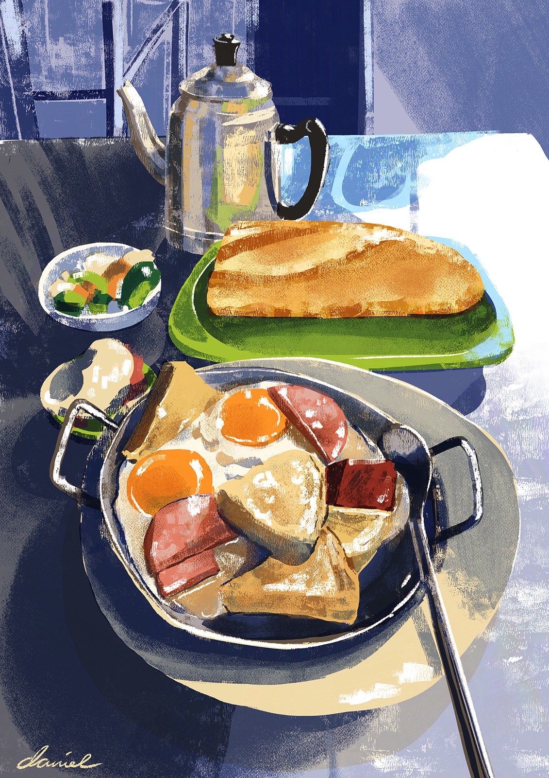 Dan: Giữa phong cảnh và thức ăn thì thực sự là thức ăn “dễ” vẽ hơn, nhưng Dan cũng đã có nhiều kinh nghiệm vẽ tranh phong cảnh nên mình không ngại chủ đề nào cả, miễn là mình thích cái chủ thể mà mình đang vẽ mà thôi. Áp dụng những gì mình học được với tính ‘tổng thể’ và hoàn chỉnh’ trong việc vẽ tranh phong cảnh, Dan đã có cách tiếp cận tương tự với thực phẩm – không chỉ món ăn mà còn cả bối cảnh của nó, càng chân thực trong trí nhớ của mình càng tốt. Thức ăn là một chủ đề thân thuộc đối với Dan vì mình là một người cũng khá mê ăn uống, vì vậy, mình sẽ dễ dàng đi vào chi tiết hơn, nhưng cũng cố gắng tiết chế bản thân để chỉ bày ra vừa đủ – cũng giống như bạn không thể nấu quá chín hoặc ăn quá nhiều! Chọn màu sắc phù hợp và tạo ra sự rung cảm để tăng cường sự hấp dẫn cho món ăn cũng là một thách thức, nhưng Dan đã học được rất nhiều trong quá trình thực hiện.