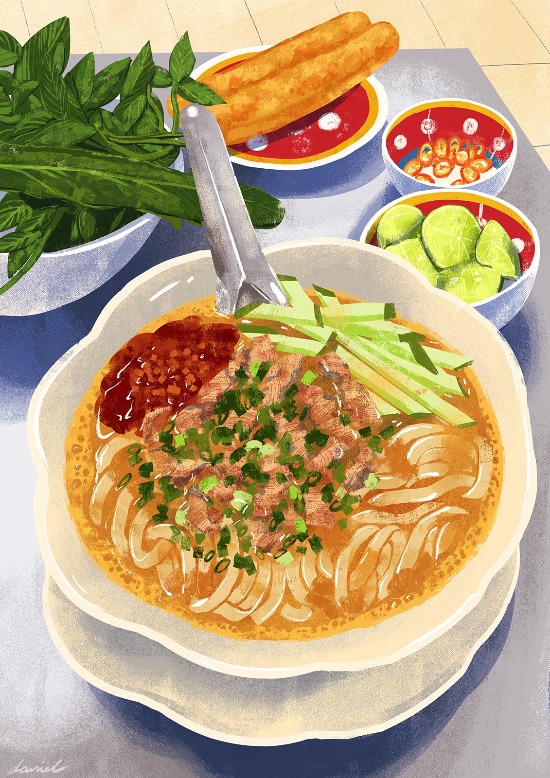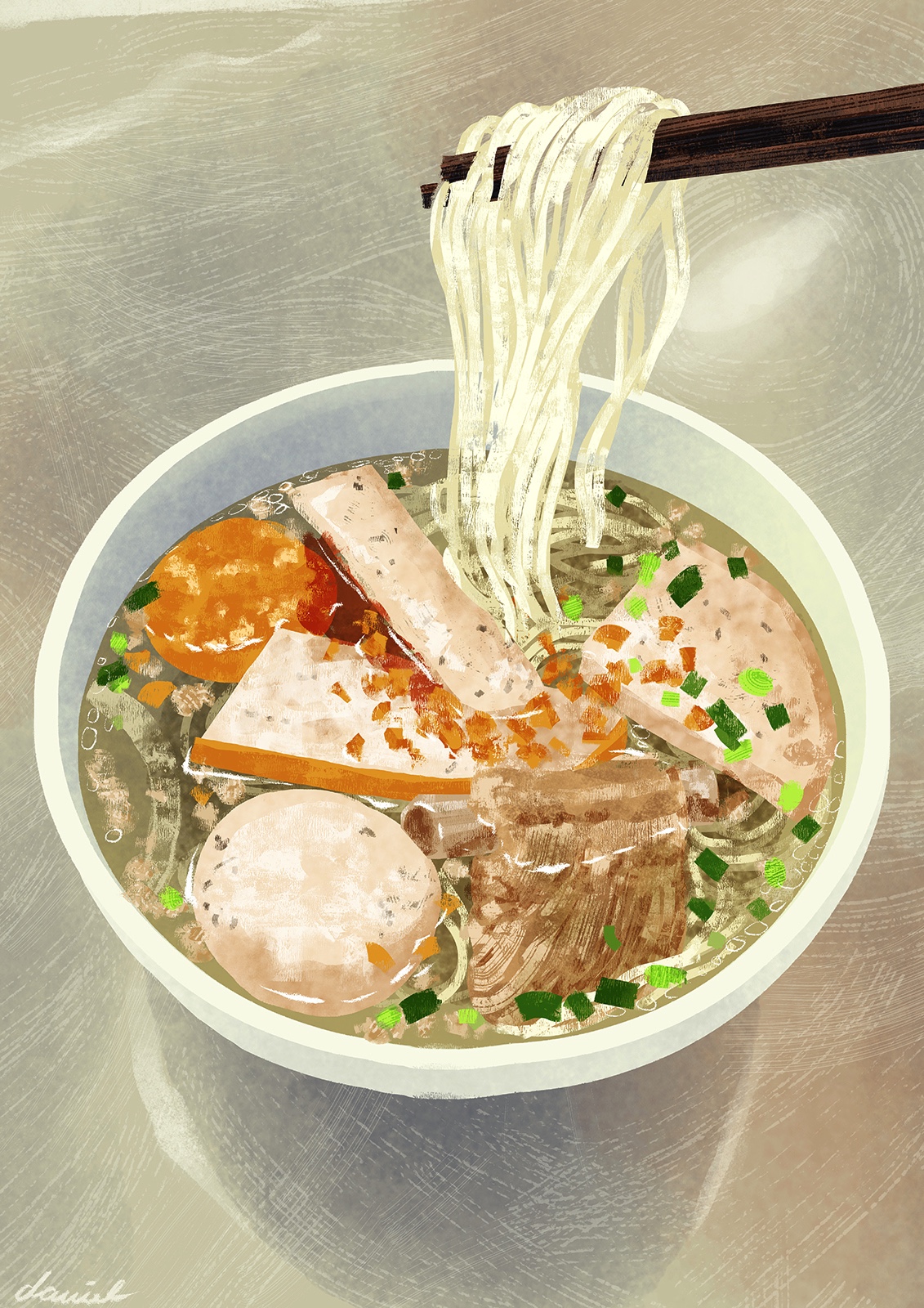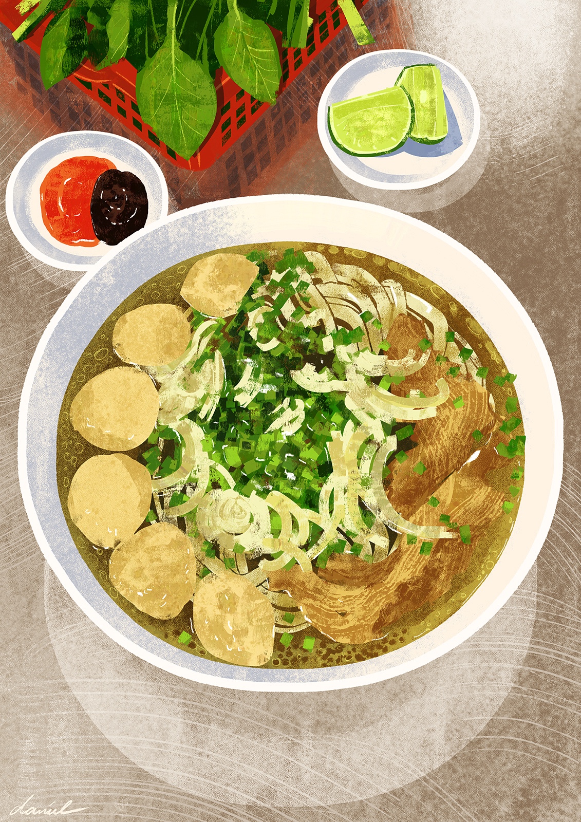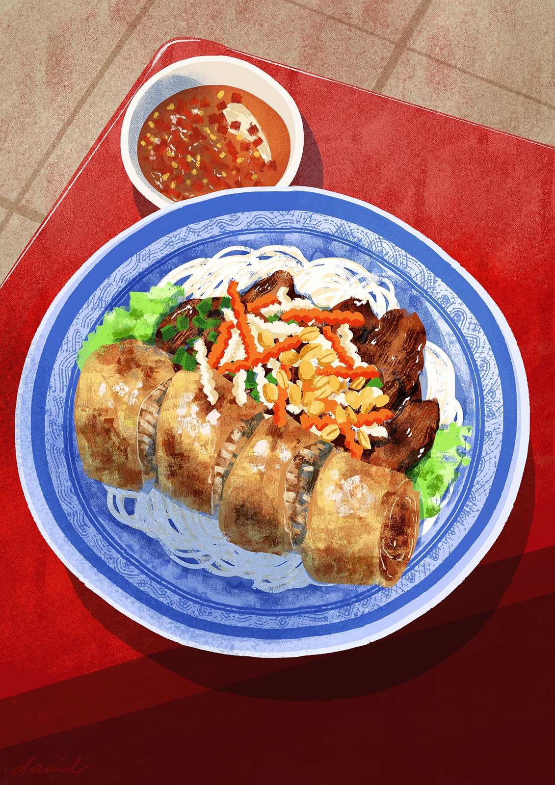 Dan: Thực ra là cũng tương đồng. Dan phải thử các món ăn này trước rồi sau đó mới quyết định mình có muốn vẽ về nó và chia sẻ với mọi người hay không. Mình nhận được rất nhiều lời giới thiệu từ bạn bè và followers. Đôi khi mình biết đến món ăn đó nhờ đọc qua các bài báo hoặc là chỉ ngẫu nhiên thôi nhưng ngon quá và mình quyết định vẽ chúng. Dan sẽ tận hưởng cảm giác, mùi thơm, độ nóng hay độ mát, sự rung cảm, hương vị, trải nghiệm tổng thể của món ăn… Sau đó chụp lại các ảnh tham khảo rồi vẽ minh hoạ lại chúng theo cách riêng của mình, cố gắng hết sức để truyền tải món ăn dựa theo kỷ niệm đẹp nhất của cá nhân.