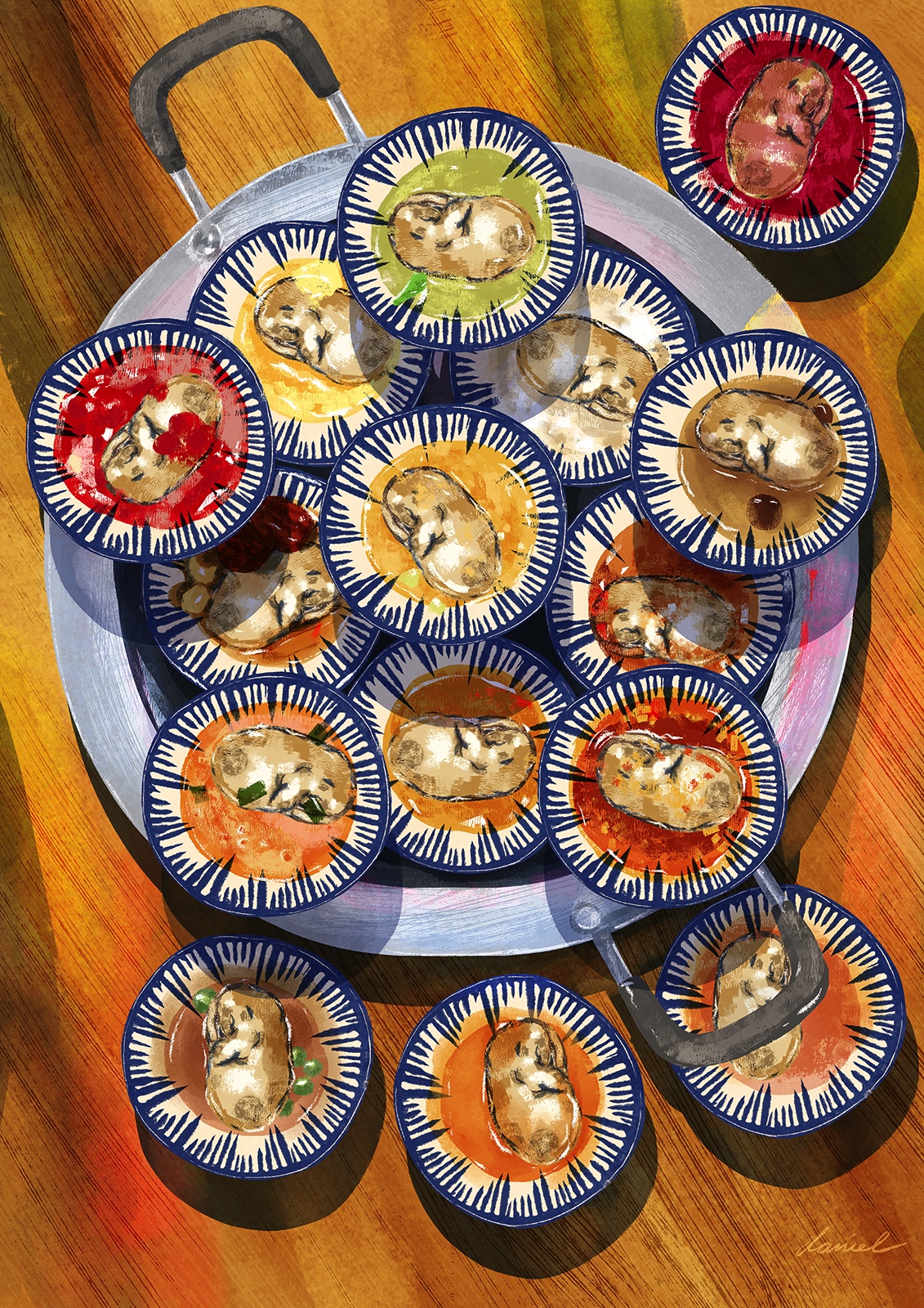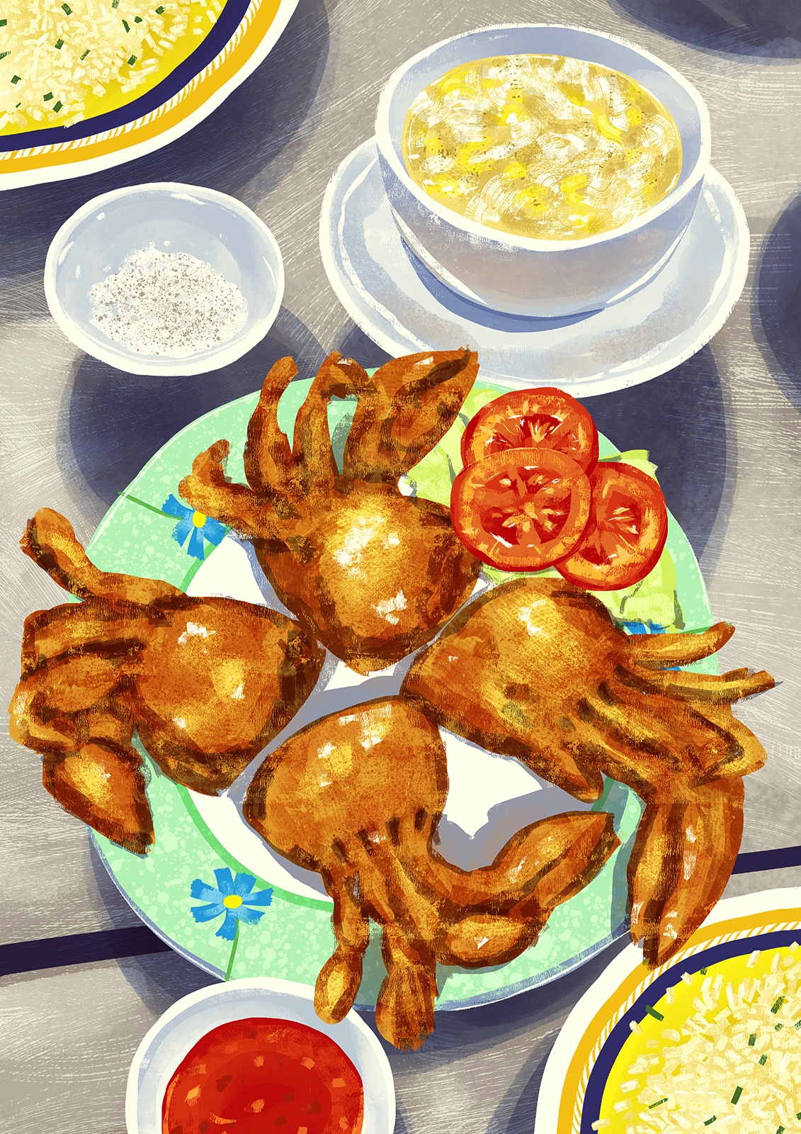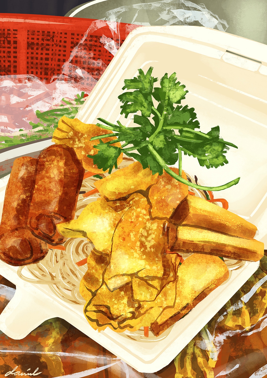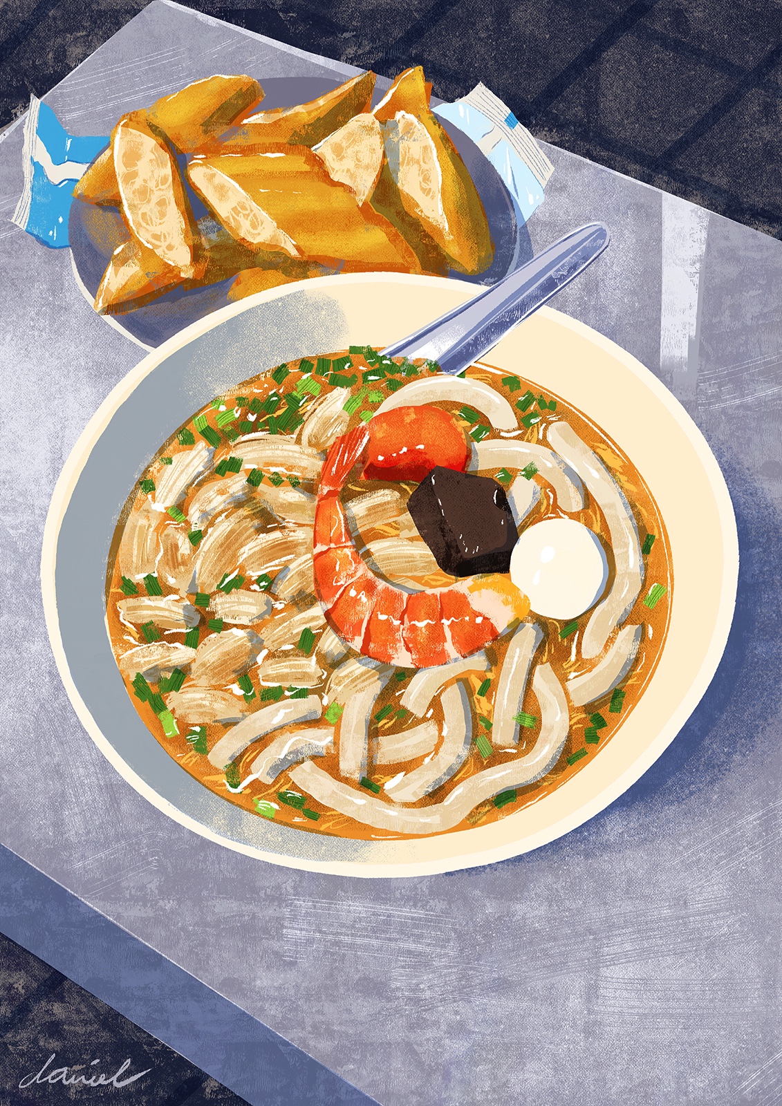 Dan: Thực ra là cũng tương đồng. Dan phải thử các món ăn này trước rồi sau đó mới quyết định mình có muốn vẽ về nó và chia sẻ với mọi người hay không. Mình nhận được rất nhiều lời giới thiệu từ bạn bè và followers. Đôi khi mình biết đến món ăn đó nhờ đọc qua các bài báo hoặc là chỉ ngẫu nhiên thôi nhưng ngon quá và mình quyết định vẽ chúng. Dan sẽ tận hưởng cảm giác, mùi thơm, độ nóng hay độ mát, sự rung cảm, hương vị, trải nghiệm tổng thể của món ăn… Sau đó chụp lại các ảnh tham khảo rồi vẽ minh hoạ lại chúng theo cách riêng của mình, cố gắng hết sức để truyền tải món ăn dựa theo kỷ niệm đẹp nhất của cá nhân.