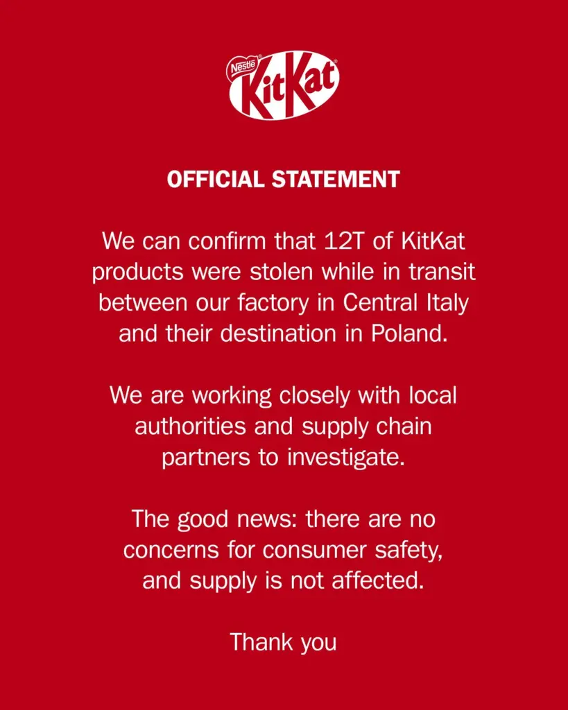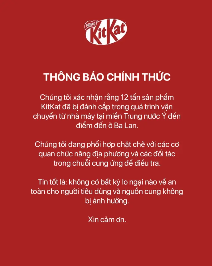 Hơn 400.000 thanh KitKat, tương đương 12 tấn chocolate đã bất ngờ bị cướp trên đường vận chuyển từ Ý sang Ba Lan. Một vụ trộm nghe như phim, nhưng lại xảy ra giữa đời thực và nhanh chóng phủ sóng truyền thông toàn cầu.