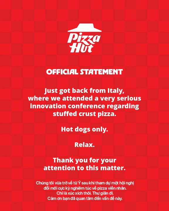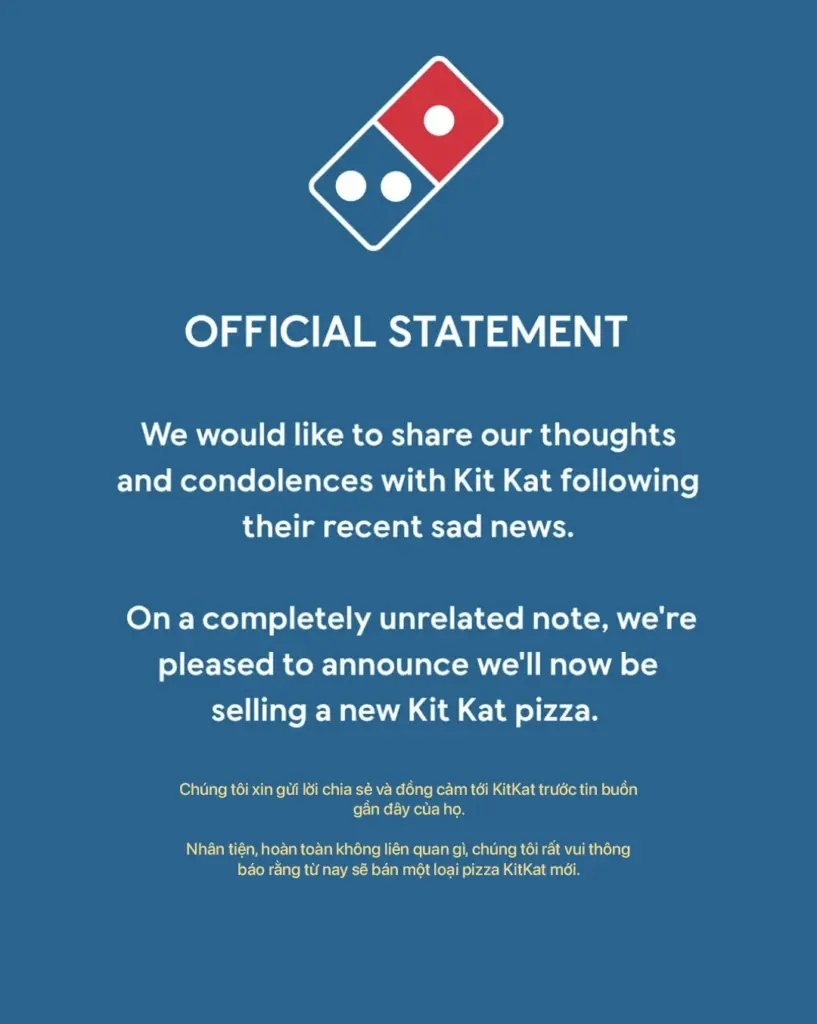 Ngay sau khi thông báo của KitKat về vụ trộm 12 tấn chocolate được đăng tải, Domino’s Pizza và Pizza Hut đã nhanh tay “đu trend” với bảng thông báo hài hước của mình.