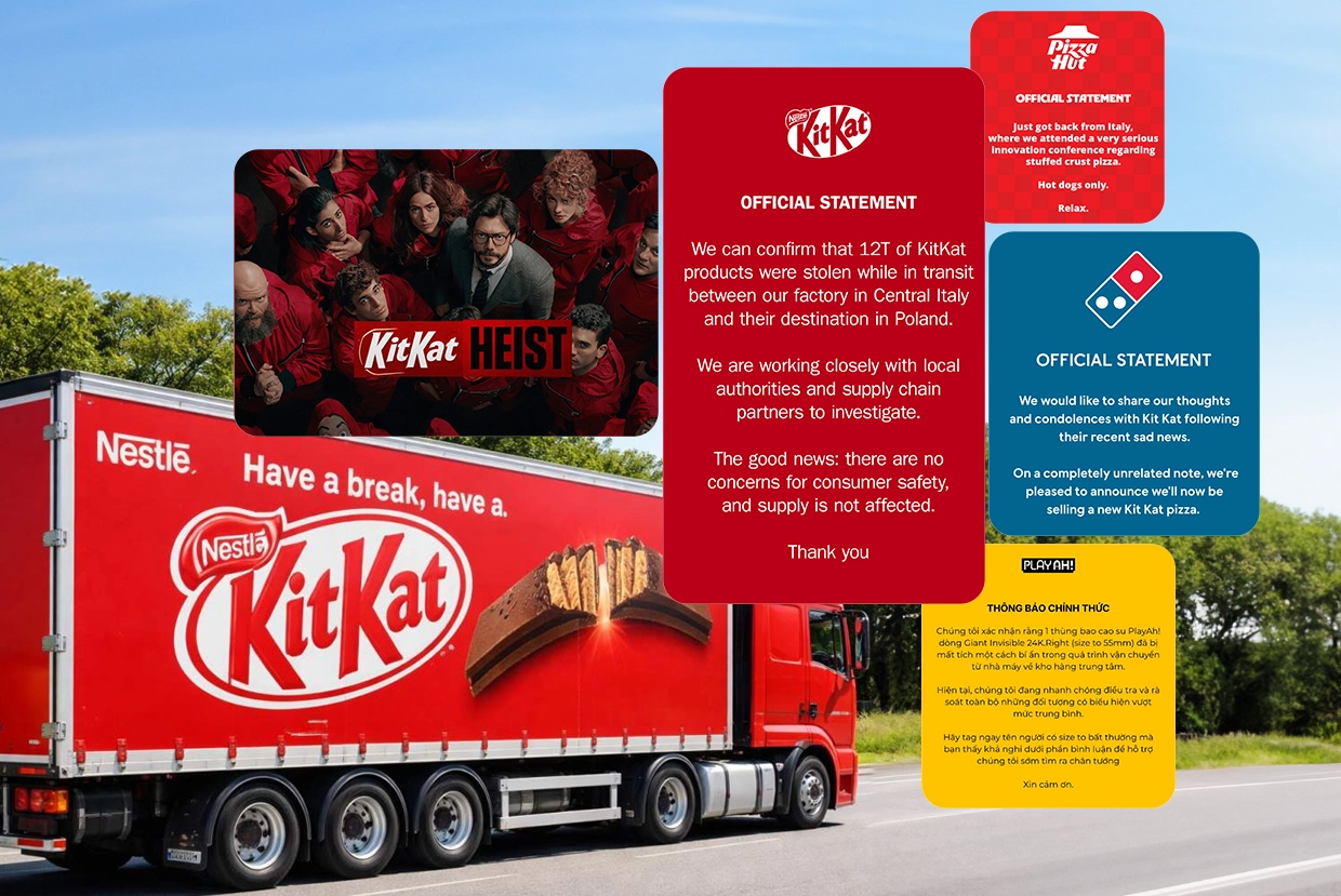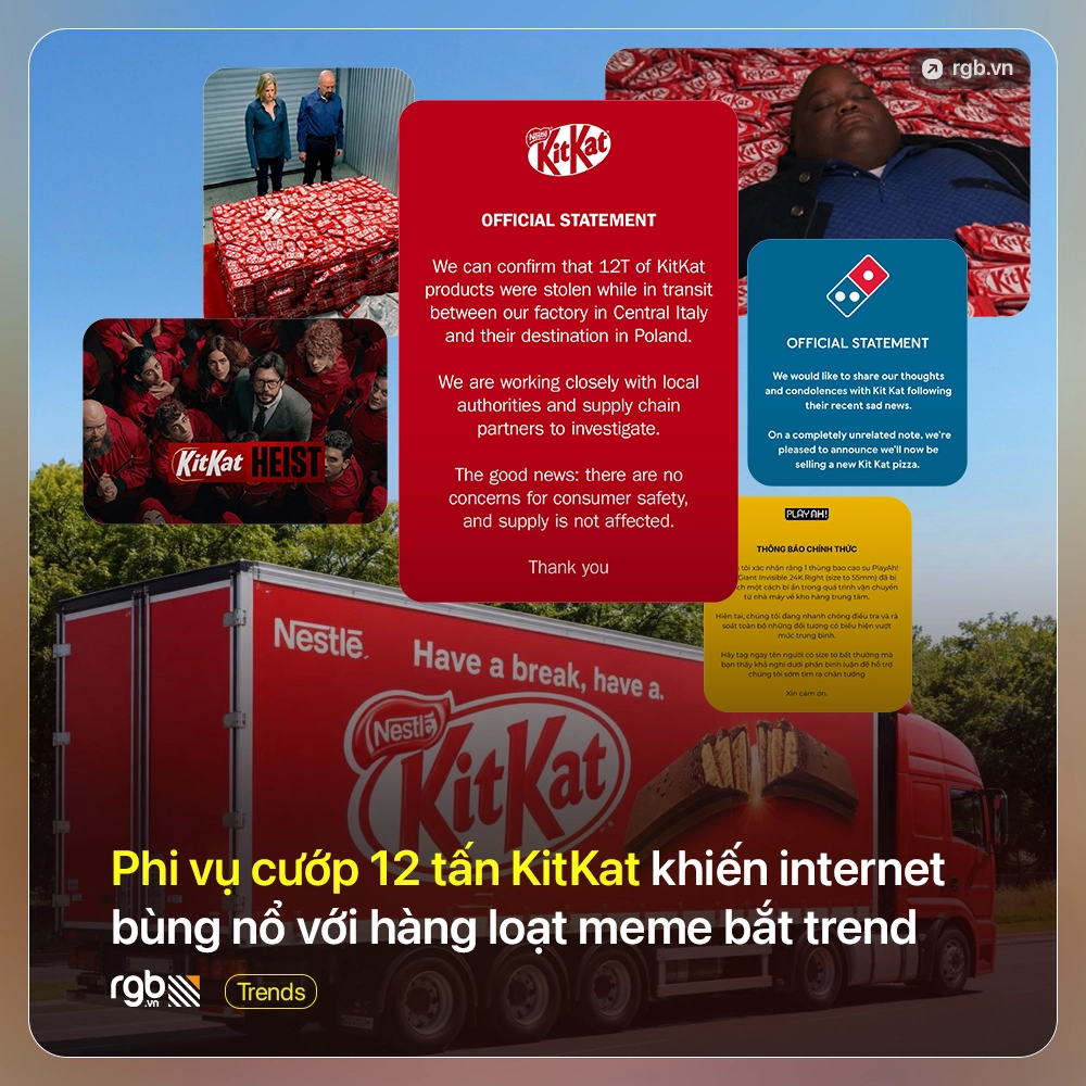 Phi vụ cướp 12 tấn KitKat đã khiến internet bùng nổ với hàng loạt meme và những màn bắt trend của các thương hiệu.