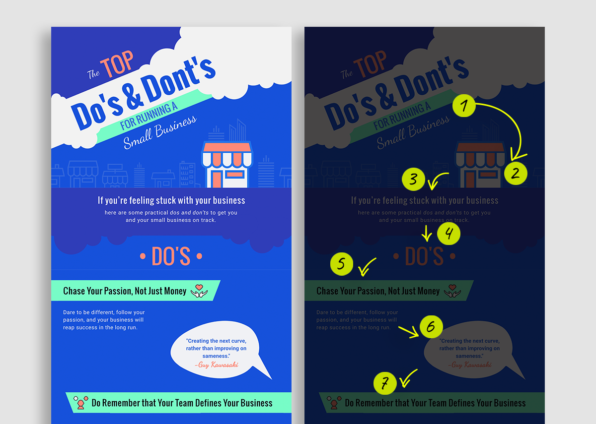 Một mẹo tuyệt vời khác là luôn làm cho phần nội dung trong thiết kế của bạn trở nên dễ đọc. Để làm được điều này, bạn có thể sử dụng màu sắc tương phản giữa background và màu văn bản, lựa chọn những font chữ dễ đọc cho phần nội dung, sắp xếp tiêu đề chính – tiêu đề phụ, căn chỉnh kích thước và khoảng cách giữa các phần nội dung hợp lý,…