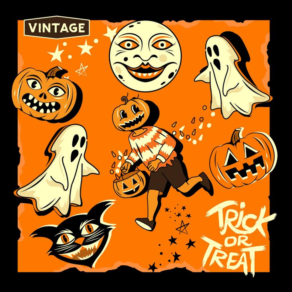 Bộ sưu tập ảnh các nhân vật và đồ trang trí Halloween theo phong cách cổ điển.