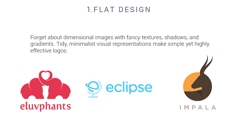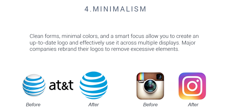 Hình thức đơn giản, màu tối giản hóa, và tập trung hướng mắt một cách thông minh có thể giúp bạn tạo ra một logo mới mẻ, dễ dàng thể hiện trên nhiều phương thức trình bày đa dạng. Hầu hết các công ty lớn đều thay đổi logo theo phong cách này, nhằm loại bỏ những yếu tố không cần thiết.