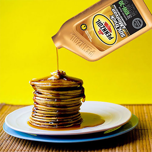 Dù có hương vị thật tuyệt vời nhưng siro cây thích (maple syrup) không phải sự lựa chọn lý tưởng cho những bức ảnh đẹp. Lúc này, chúng ta sẽ cần đến một loại “siro” khác: Dầu máy. Với độ đặc sánh và óng ả hiếm có, rõ ràng dầu máy hơn đứt siro cây thích ở độ ăn ảnh. Đặc biệt, việc sử dụng dầu máy thay cho siro dường như là sự lựa chọn hàng đầu và bất khả kháng để cho ra những bức ảnh quảng cáo pancake nịnh mắt nhất có thể.
