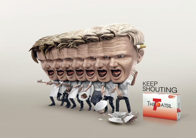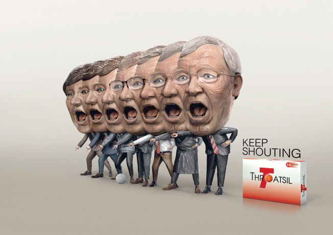 Những người có tiếng hay la hét Alex Ferguson, Gordon Ramsay và Mick Jagger xuất hiện trong các mẩu quảng cáo thuốc viêm họng từ Thái Lan với những hình ảnh được lặp lại một cách đáng tò mò.