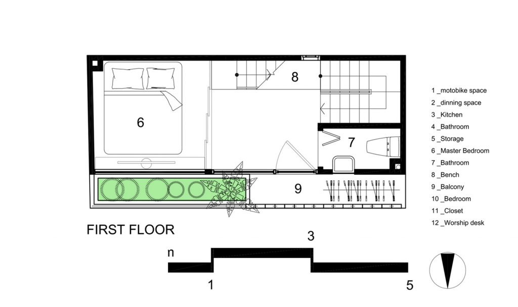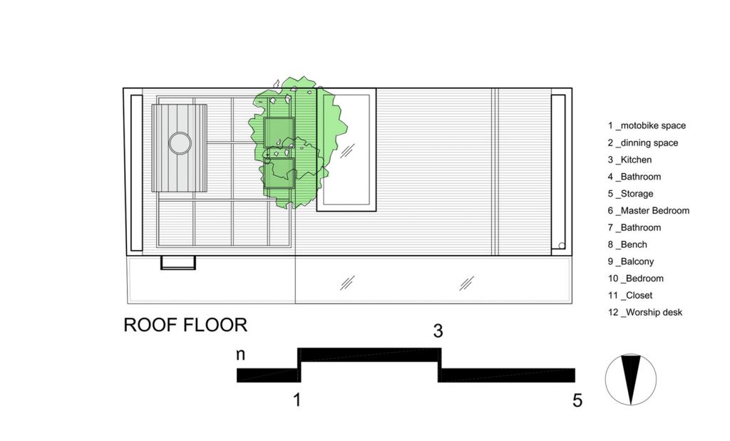 Khách hàng và kiến trúc sư tình cờ có cùng sở thích về ánh sáng tự nhiên và thực vật. Nên một nửa ban công là thùng cây, thêm chút màu xanh quý giá cho tầm nhìn từ phòng ngủ chính. Phần còn lại của ban công được ẩn sau một bức tường bê tông hoa văn. Ánh sáng kết hợp tốt với hộp tưới cây tự động trên mái cùng nhau mang lại ánh sáng và đổ bóng xanh mát xuống phòng ngủ của trẻ.