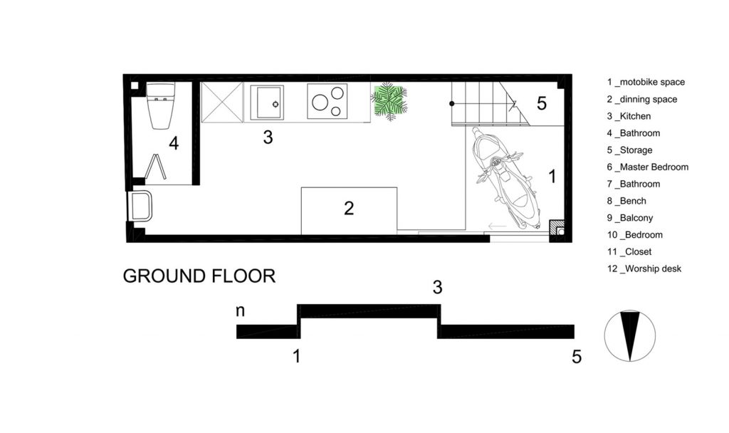 Tầng trệt kết hợp phòng khách, phòng ăn tối và nhà bếp. Để các chức năng này hoạt động linh hoạt và tận dụng tối đa không gian, sàn được nâng lên chừa không gian bên dưới để chứa đồ và cũng có thể làm băng ghế ăn tối cho bàn nâng thẳng đứng.