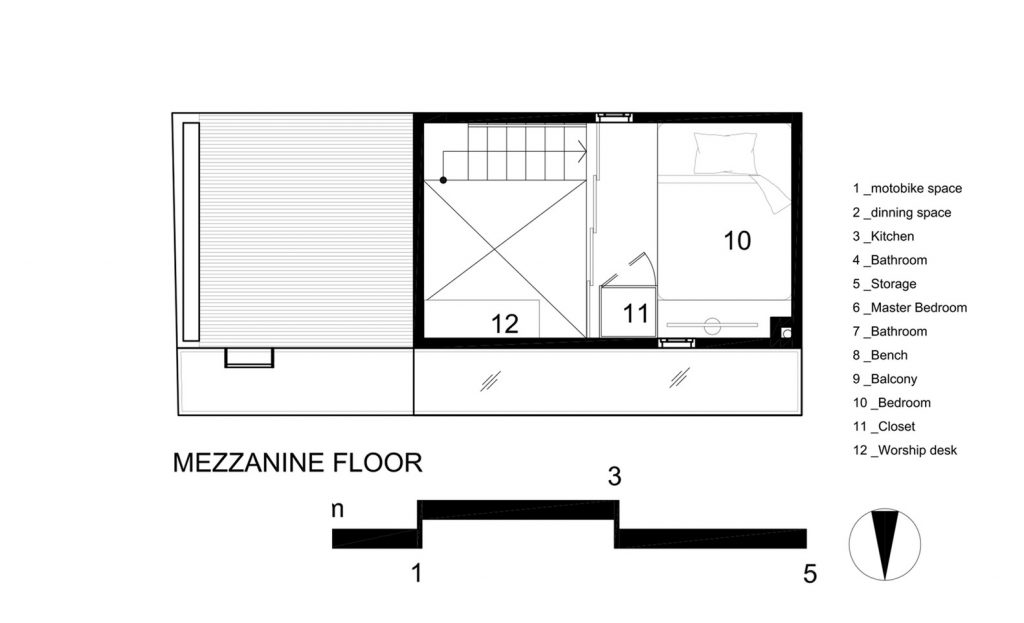 Tầng trên và một gác lửng gồm 2 phòng ngủ cho bố mẹ và con. Ý tưởng thiết kế nội thất nhằm mục đích hướng đến các phòng ngủ có không gian mở về ánh sáng và thông gió tốt. Không gian riêng tư được bao bọc bởi cửa tre trượt linh hoạt. Trong phòng ngủ, sàn cũng được nâng để lấy không gian bên dưới làm kho chứa đồ. Đây là yếu tố then chốt giúp không gian ấm cúng dường như rộng hơn và nhẹ nhàng hơn.