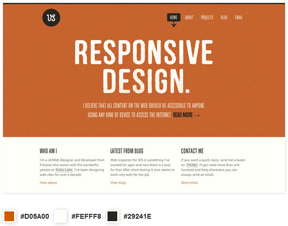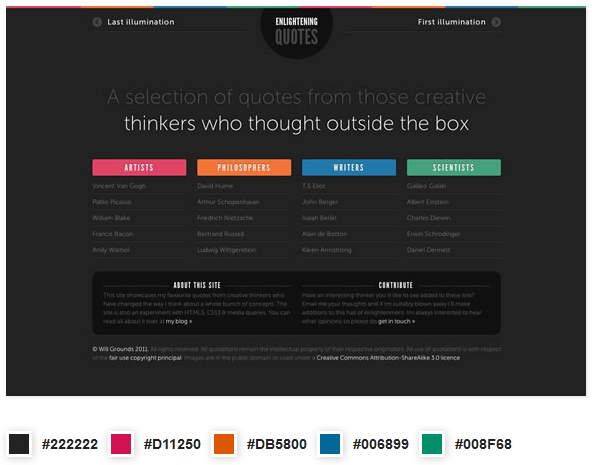 Hôm nay chúng tôi sẽ giới thiệu cho bạn một số ví dụ trong cách chọn màu sắc cho các trang web. Từng màu sắc được sử dụng trong mỗi thiết kế quả thật là sự kết hợp tuyệt vời. Nó đã tạo được cảm hứng cũng như mang đến cho người xem một cái nhìn đẹp mắt và chúng ta sẽ được nhìn thấy nhiều phong cách được thể hiện trong mỗi trang web. Từ những trang web có màu sắc tinh tế, nhẹ nhàng cho đến những trang web có màu sắc duo mạnh mẽ, nhiều màu.