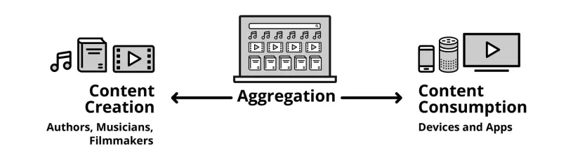 Để hiểu chi tiết hơn, ta hãy nhìn vào chuỗi giá trị cơ bản mà Jeff Bezos dùng để trình bày với đội ngũ của ông: sản xuất nội dung (Content Creation); trung gian tổng hợp nội dung (Aggregation); tiêu thụ nội dụng (Content Consumption).