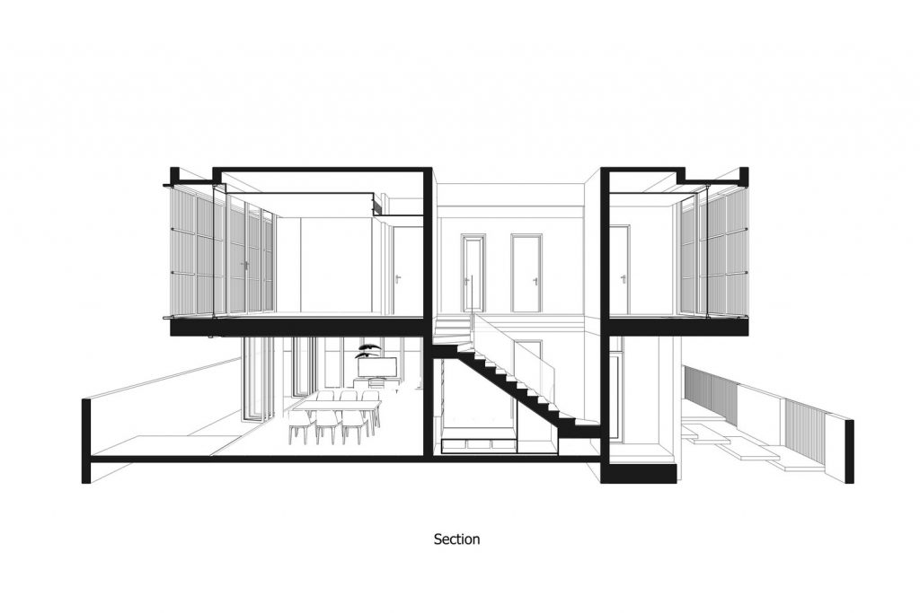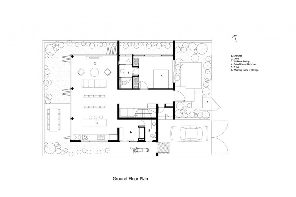 Phần quan trọng nhất của ngôi nhà là nhà bếp ở phía sau cùng với một khu vườn nhỏ. Tất cả các hoạt động trong các không gian này đều được kết nối với khu vườn bằng sự cơ động của cửa trượt, tạo cảm giác như thể các không gian này là một thể thống nhất và riêng tư. Bên cạnh đó, phòng ngủ được đặt ở khu chính của ngôi nhà trên tầng 1. Phòng ngủ này dành cho ông bà vì là những người lớn tuổi, ưu tiên của họ là sự thuận tiện trong mọi sinh hoạt hàng ngày. Phòng ngủ của họ cũng được kết nối trực tiếp với khu vườn nhỏ bên ngoài, đảm bảo sự thông thoáng và mát mẻ nhưng vẫn an toàn trước các tác nhân bên ngoài.