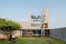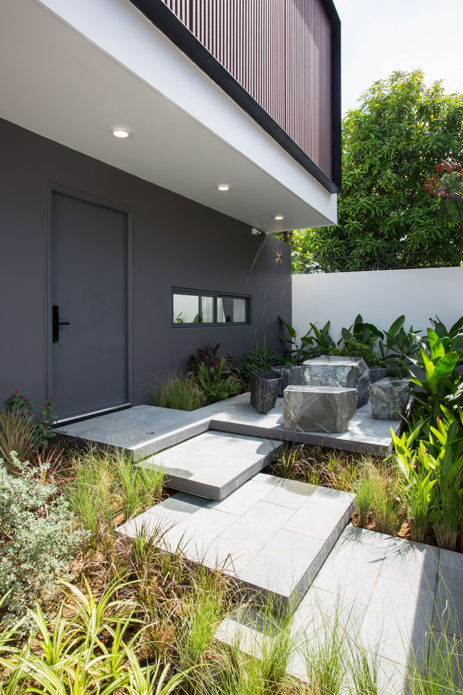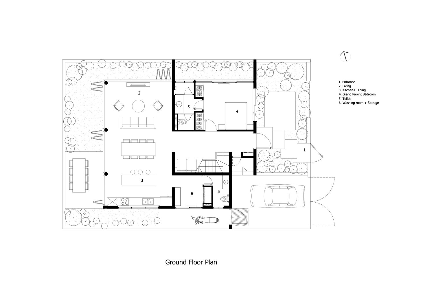 Phần quan trọng nhất của ngôi nhà là nhà bếp ở phía sau cùng với một khu vườn nhỏ. Tất cả các hoạt động trong các không gian này đều được kết nối với khu vườn bằng sự cơ động của cửa trượt, tạo cảm giác như thể các không gian này là một thể thống nhất và riêng tư. Bên cạnh đó, phòng ngủ được đặt ở khu chính của ngôi nhà trên tầng 1. Phòng ngủ này dành cho ông bà vì là những người lớn tuổi, ưu tiên của họ là sự thuận tiện trong mọi sinh hoạt hàng ngày. Phòng ngủ của họ cũng được kết nối trực tiếp với khu vườn nhỏ bên ngoài, đảm bảo sự thông thoáng và mát mẻ nhưng vẫn an toàn trước các tác nhân bên ngoài.
