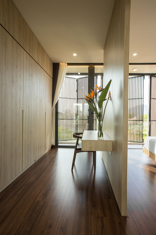 Tầng 2 gồm 3 phòng ngủ và phòng thờ. Trong đó có một phòng ngủ cho hai vợ chồng, một phòng ngủ chung cho con cái và một phòng ngủ còn lại dùng tạm làm khu vui chơi, đọc sách và thư giãn của gia đình. Khi bọn trẻ lớn lên, căn phòng ngủ thừa đó sẽ trở thành nơi riêng tư của chúng. Tất cả các phòng đều tràn ngập ánh sáng và gió trực tiếp. KTS đã nghiên cứu rất kỹ về các yếu tố môi trường ảnh hưởng đến khu vực này, do đó họ đã lắp đặt các tấm chắn nắng ở cả mặt trước và mặt sau để giảm tác động của nắng nóng mùa hè và chủ động đón ánh sáng và gió. Nhà vệ sinh cũng được thiết kế tương tự để nhận được ánh sáng, gió và cây xanh tốt nhất.