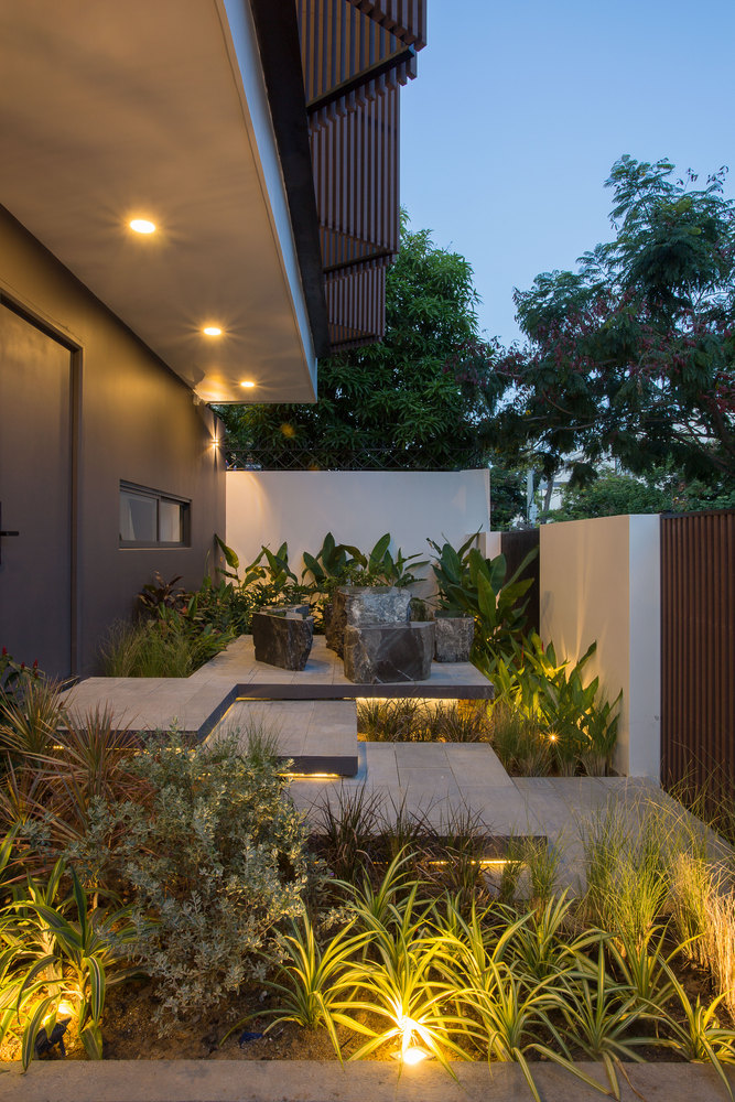 Để ngôi nhà luôn mát mẻ vào mùa hè, ngoài hệ thống lam chắn nắng, còn có các biện pháp chống nóng mái tôn. Giải pháp là sử dụng tấm cách nhiệt XPS 4cm. Nó tạo ra năng suất tuyệt vời chống lại cái nóng và tiết kiệm điện. Để giữ an toàn cho ngôi nhà, KTS đã thiết kế hệ thống an ninh và báo động bằng cảm biến và camera. Ngoài ra, ngôi nhà còn áp dụng một số phần mềm hoàn toàn tự động hoặc được điều khiển từ bất kỳ đâu chỉ bằng một nút bấm để chăm sóc và tưới cây nhằm giảm rủi ro cho khu vườn nếu chủ nhà không có đủ thời gian chăm sóc.
