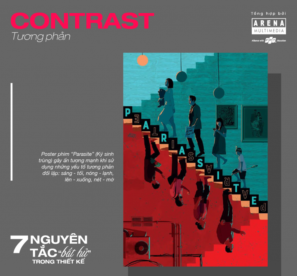 Sau nguyên tắc cân bằng thì tương phản cũng là điều bạn cần chú ý trong quá trình thiết kế. Tương phản được hình thành khi sử dụng cùng lúc các yếu tố: màu sắc (nóng- lạnh), đường nét (ngang – đứng), kích thước (lớn – nhỏ), chất liệu (mịn – thô ráp), hướng chuyển động (lên – xuống),…