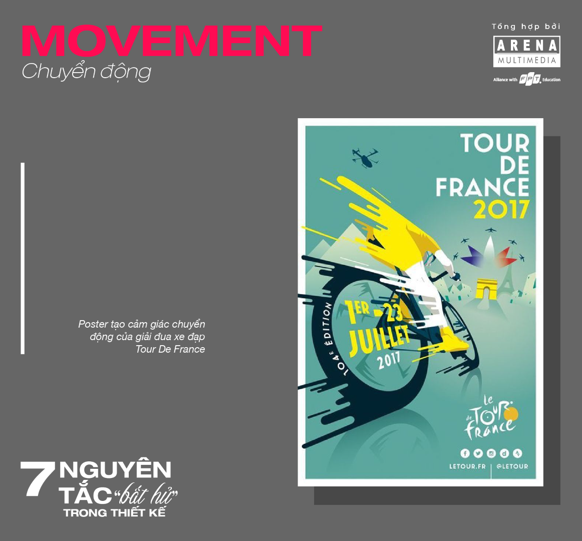 Movement là cách sử dụng các hình khối và đường nét để tạo thành đường dẫn dắt thị giác và khiến người xem có cảm giác đối tượng đang chuyển động. 3 cách tạo sự chuyển động phổ biến là: tạo hiệu ứng làm mờ, tạo đường chuyển động hoặc hiệu ứng gợn sóng.