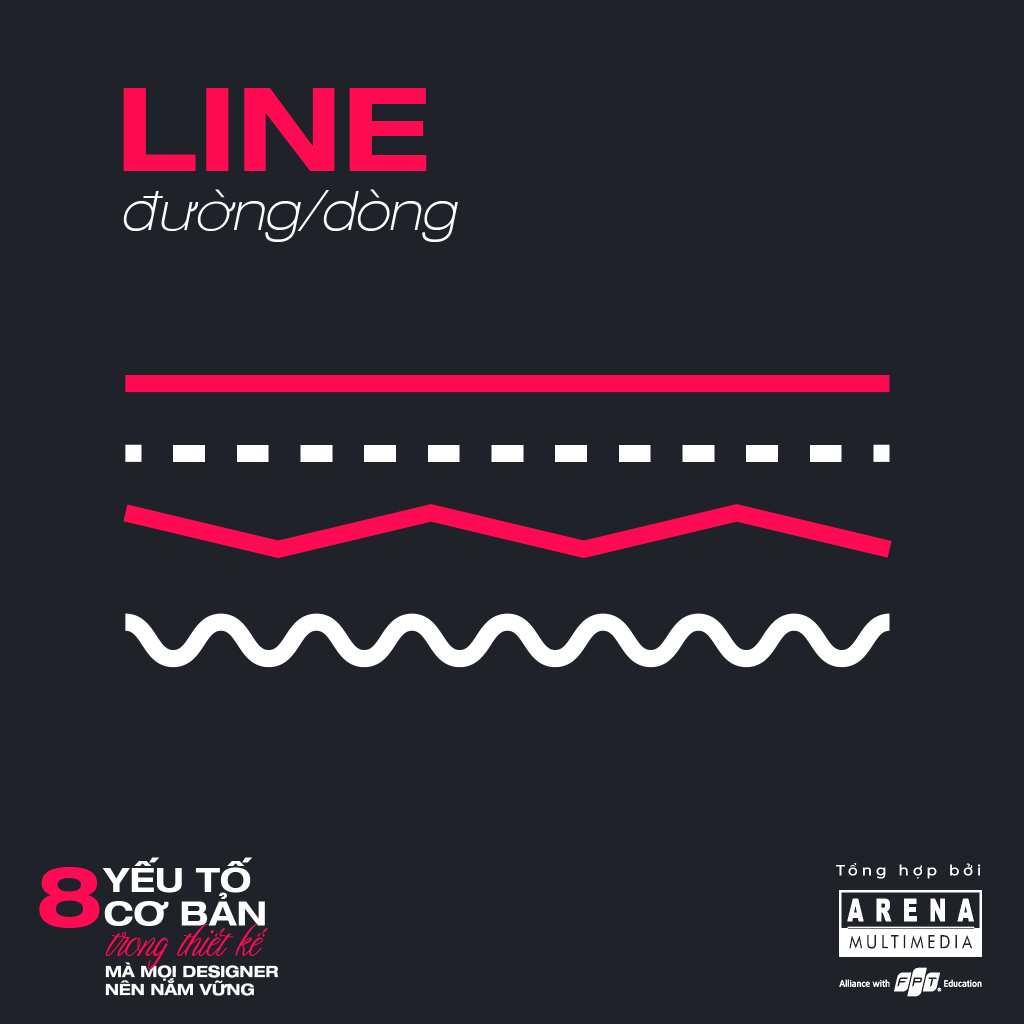 Line – Đường, đường kẻ, dòng, nét,… là yếu tố cơ bản nhất của thiết kế, với nhiều hình dạng, kích cỡ và màu sắc khác nhau. Các dạng đường phổ biến trong thiết kế gồm: đường thẳng (straight line), đường chéo (diagonal line), đường zích zắc (zigzag line) và đường cong (curved line).