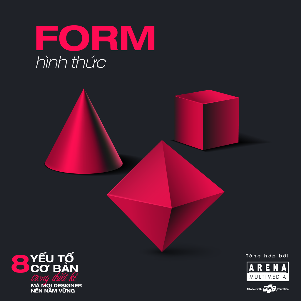 Trong Graphic Design, Form được sử dụng để xác định không gian, tạo độ tương phản và làm cho đối tượng có thêm chiều sâu. Form thường được mô tả trực quan bằng cách sử dụng các yếu tố khác như đường (line), hình dạng (shape), bổ sung Shadows (vùng tối) và thêm Highlight (vùng sáng) cho các đối tượng.
