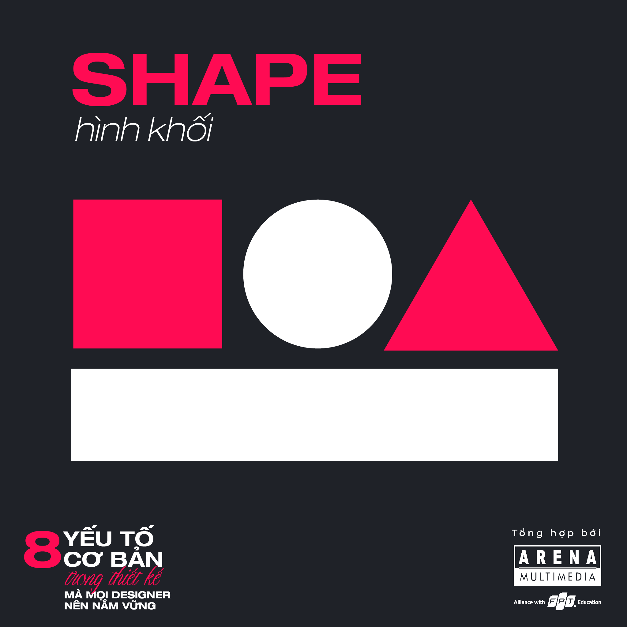 Shapes – hình khối, được xác định bởi ranh giới giữa các đường line và thường có hình dạng 2D. Shapes được sử dụng trong thiết kế để tổ chức, kết nối hoặc phân cấp thông tin. Ngoài ra, chúng còn tượng trưng, đại diện cho một khái niệm, tạo ra chiều sâu hoặc được sử dụng để trang trí. Có 3 loại shapes cơ bản đó là: Geometric shapes (hình học cơ bản), Organic shapes (hình học tự nhiên), Abstract shapes (hình học trừu tượng).