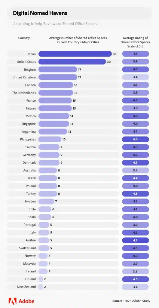 Trong khi đó, Nhật Bản, Mỹ và Bỉ là những nơi có nhiều không gian văn phòng chia sẻ tại các thành phố lớn của họ, một yếu tố quan trọng với người làm sáng tạo hay di chuyển.