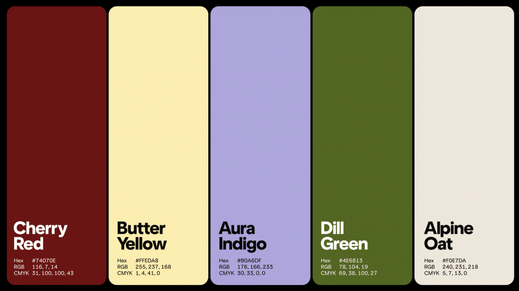 Các màu sắc bao gồm: Cherry Red (Đỏ Anh Đào), Butter Yellow (Vàng Bơ), Aura Indigo (Chàm Hào Quang), Dill Green (Xanh Thì Là), Alpine Oat (Be Núi Cao).