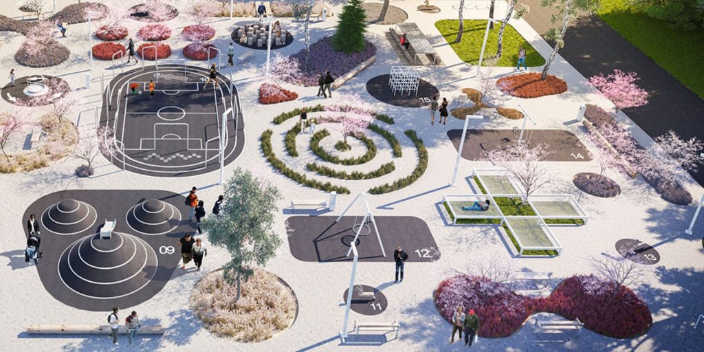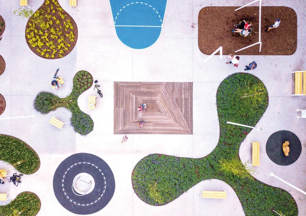 Nhiều người nhận xét quảng trường này trông giống như vừa bị một chiếc máy bay ném bom kiến trúc vậy. Và đó là một lời khen! Những tấm bê tông được lấp đầy với hàng chục khu vực nhỏ hơn được thiết kế cho các hoạt động riêng lẻ: nơi để giải trí với các thiết bị vui chơi, nơi tập thể dục, những khu vực yên tĩnh với các yếu tố kiến trúc nhỏ và cây xanh được thiết kế riêng, The Activity Park với thiết kế phù hợp cho người lớn tuổi, v.v…