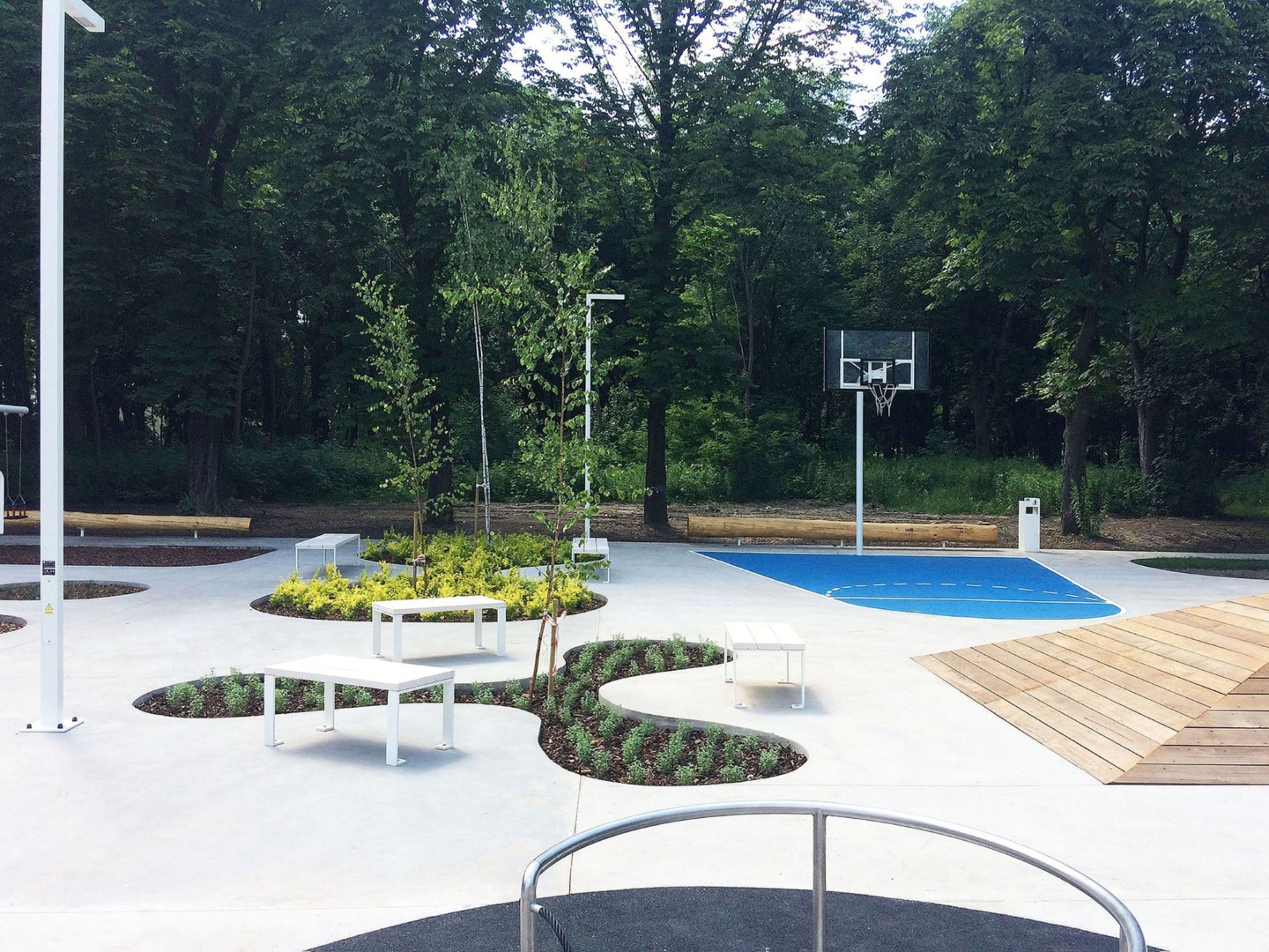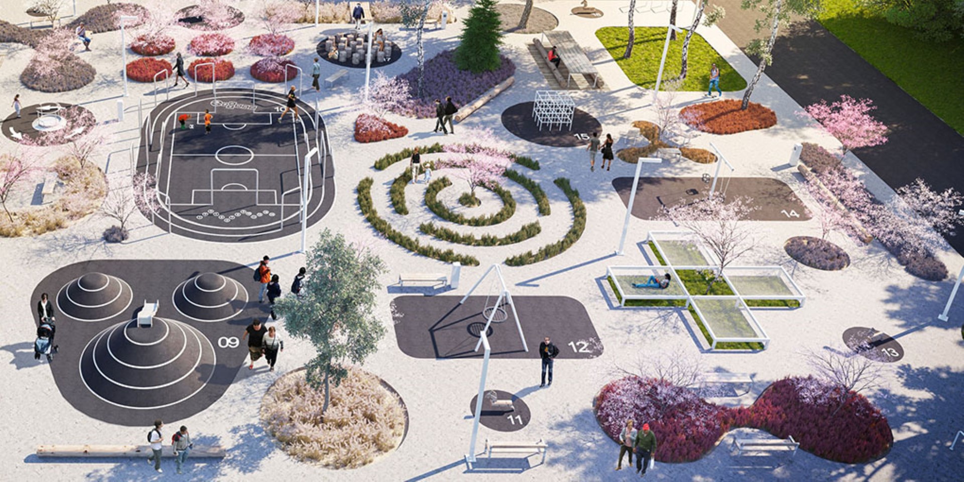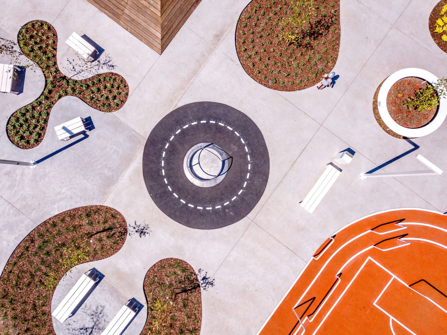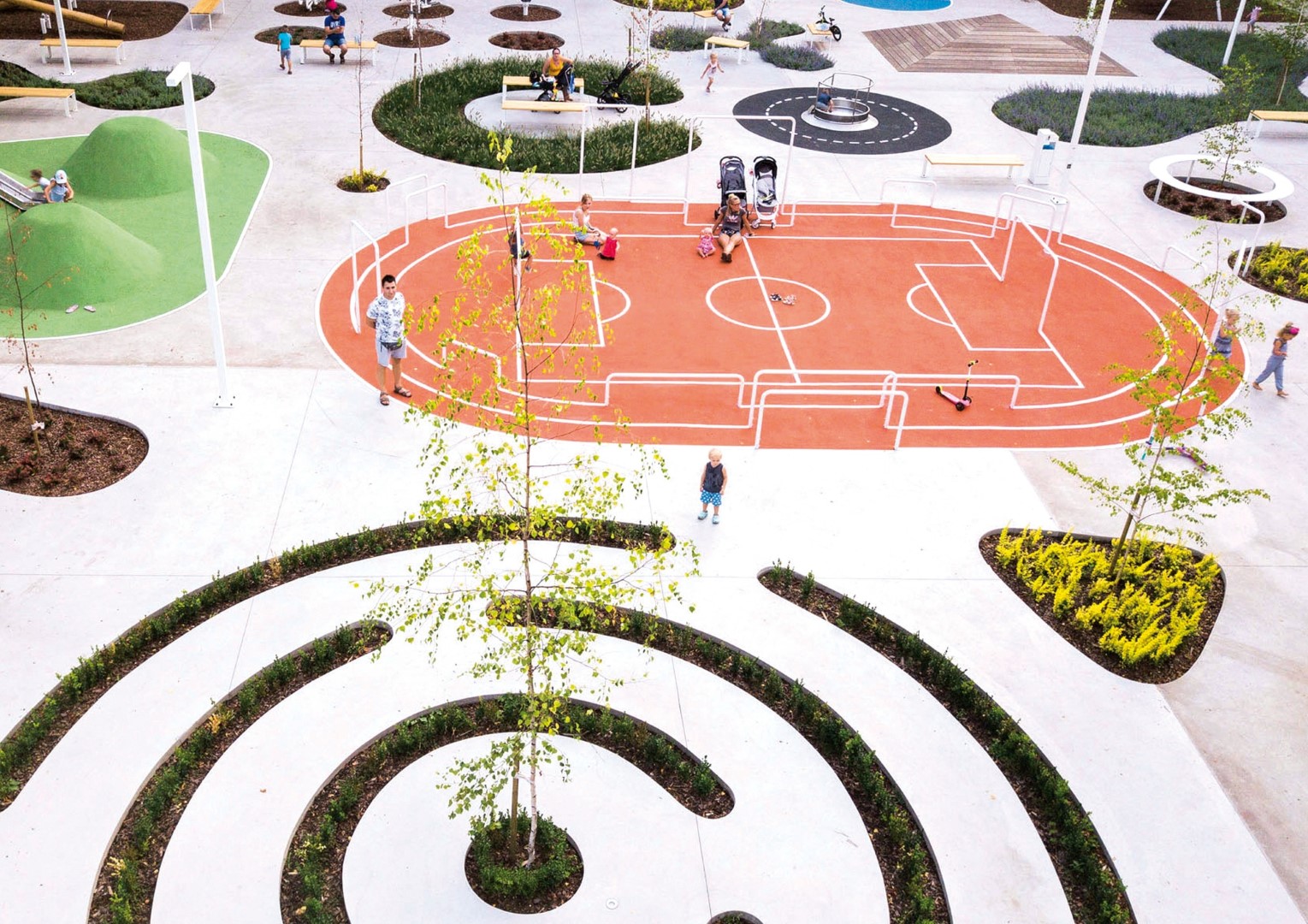 Nhiều người nhận xét quảng trường này trông giống như vừa bị một chiếc máy bay ném bom kiến trúc vậy. Và đó là một lời khen! Những tấm bê tông được lấp đầy với hàng chục khu vực nhỏ hơn được thiết kế cho các hoạt động riêng lẻ: nơi để giải trí với các thiết bị vui chơi, nơi tập thể dục, những khu vực yên tĩnh với các yếu tố kiến trúc nhỏ và cây xanh được thiết kế riêng, The Activity Park với thiết kế phù hợp cho người lớn tuổi, v.v…