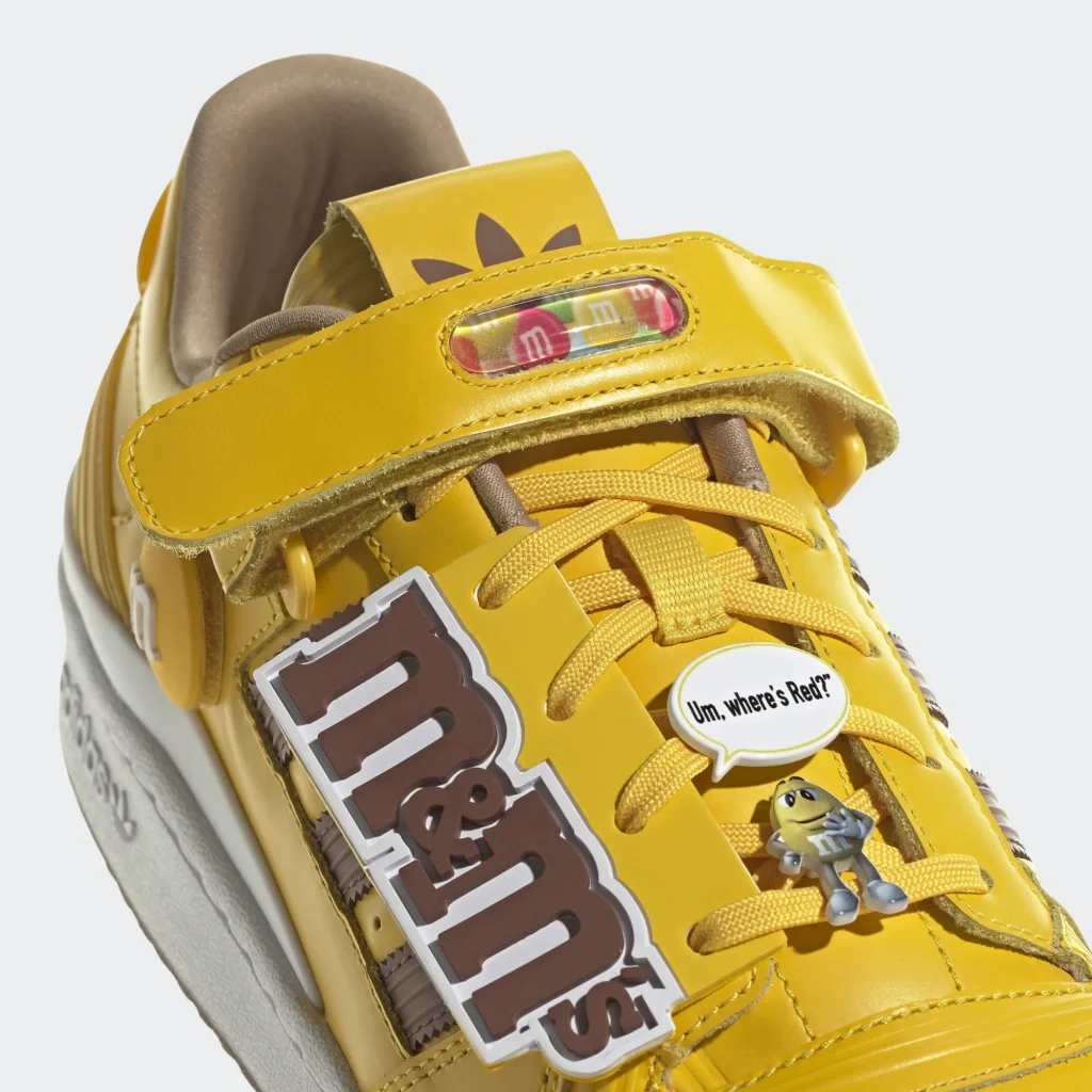 Đôi giày táo bạo này có màu vàng tươi sáng làm chủ đạo cùng logo có thể tháo rời của M&M’s, với phần da phía ngoài được làm mờ giống như cách M&M’s đóng gói các bịch sô cô la đậu phộng của mình.