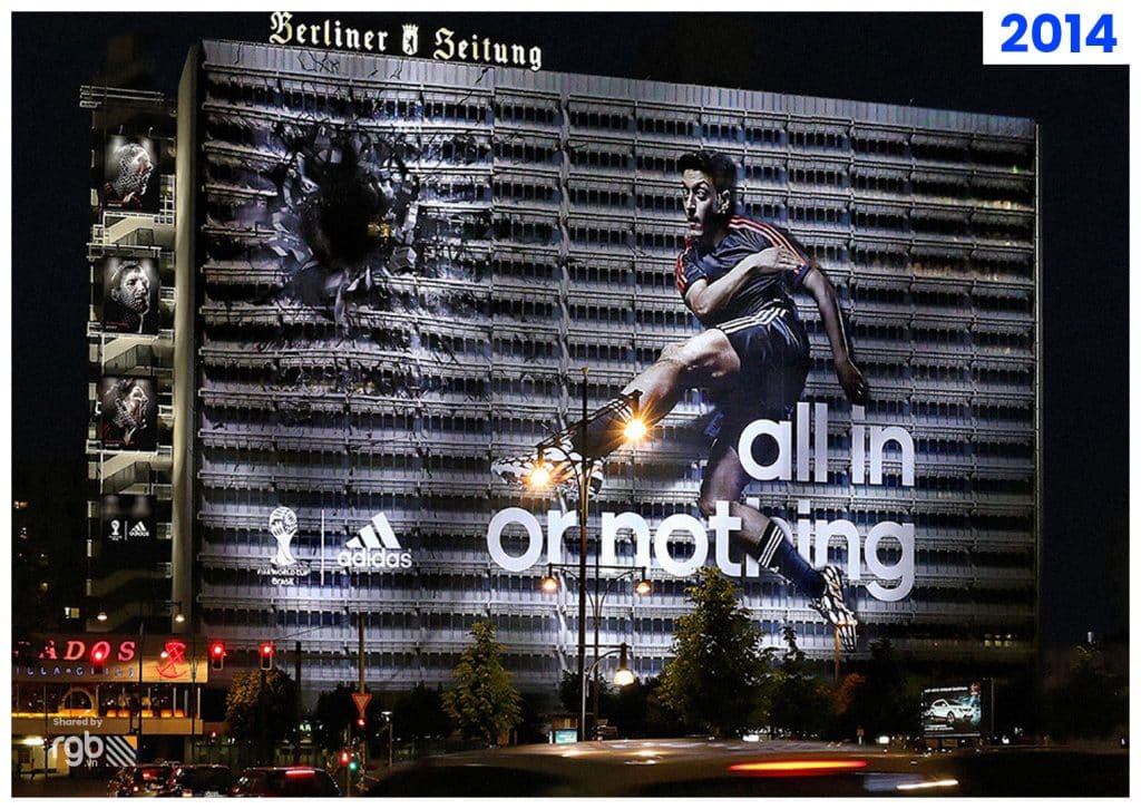 Kỳ World Cup 2014, adidas cũng từng chơi lớn với tấm poster phủ kín mặt ngoài tòa nhà Berlin Zeitung, gây ấn tượng với hình ảnh tiền vệ đội tuyển Đức Mesut Oezil sút bóng thủng tường.