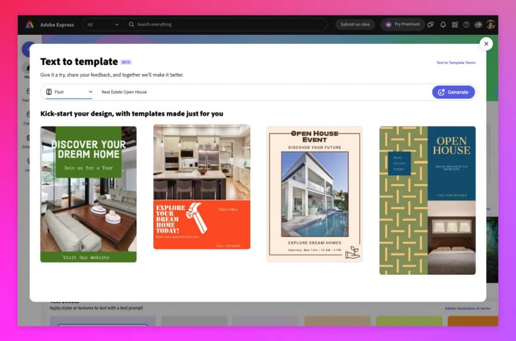 Để bắt đầu, bạn chỉ cần truy cập vào trang chủ Adobe Express và chọn ‘Generative AI’. Cuộn xuống cho đến khi bạn thấy ‘Text to Template’, ở đó bạn có thể điền nội dung cần thiết và loại thiết kế bạn cần sau đó nhấp vào nút ‘Generate’.