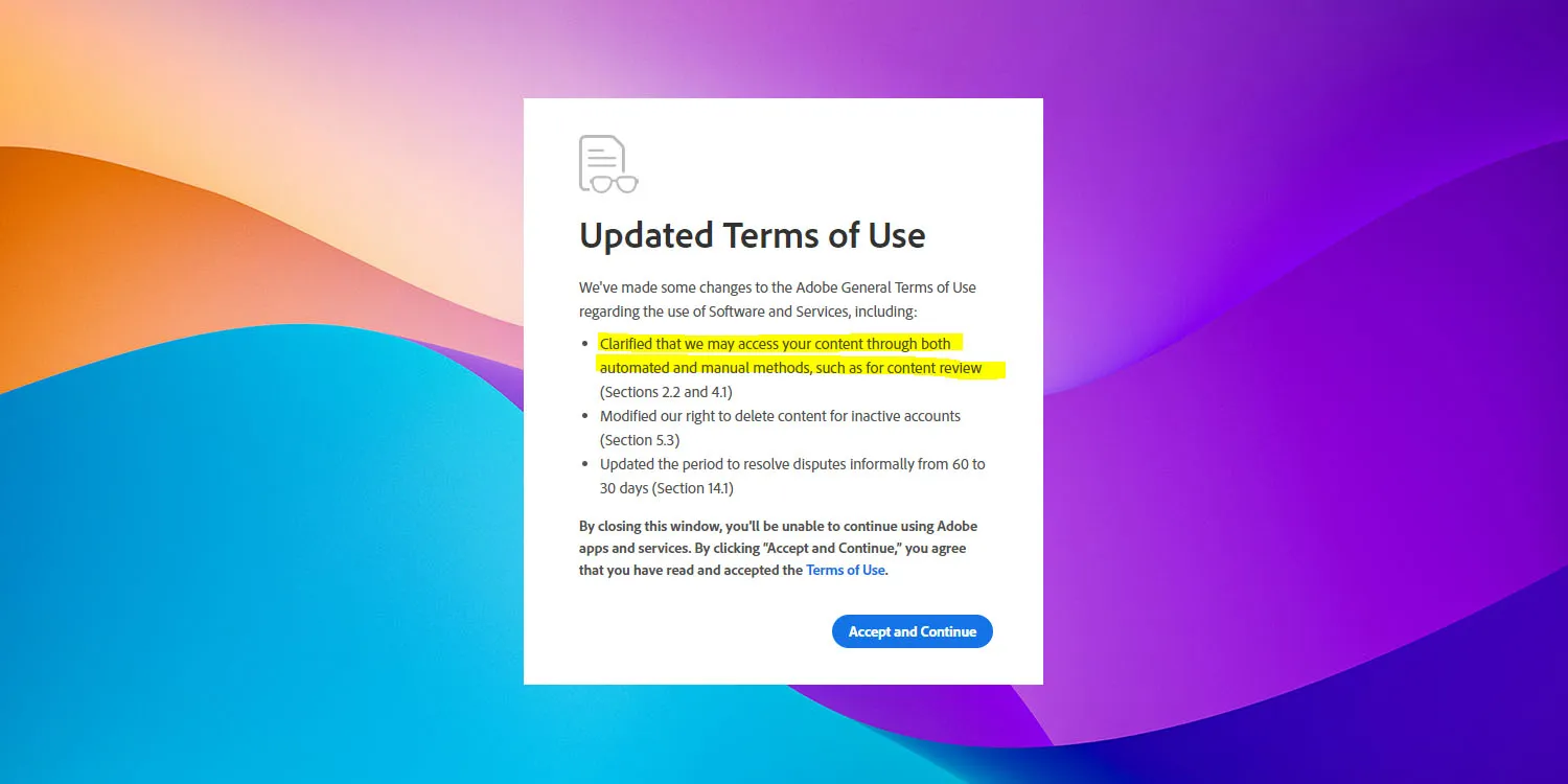 Một cơn bão đã nổi lên ở Adobe Creative Cloud, khi công ty dẫn đầu ngành về phần mềm sáng tạo đang phải đối mặt với phản ứng dữ dội từ người dùng sau bản cập nhật “Điều khoản sử dụng chung”. Các quy tắc mới đã làm dấy lên mối lo ngại về quyền riêng tư và quyên sở hữu của người dùng, thậm chí một số người còn gọi chúng là “giống như phần mềm gián điệp”.