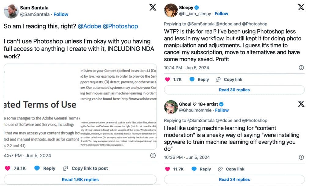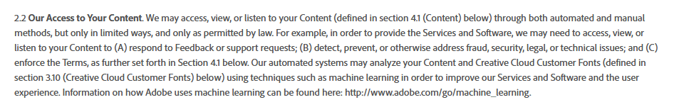 Làm tăng thêm lo lắng, các điều khoản cập nhật nêu rõ khả năng của Adobe trong việc truy cập và xem xét kỹ lưỡng các tác phẩm của người dùng thông qua cả phương pháp tự động và thủ công, bao gồm cả việc sử dụng máy học. Điều này làm dấy lên nghi ngờ về việc công ty có ý định tận dụng tất cả nội dung do người dùng tạo để đào tạo các mô hình trí tuệ nhân tạo của mình.