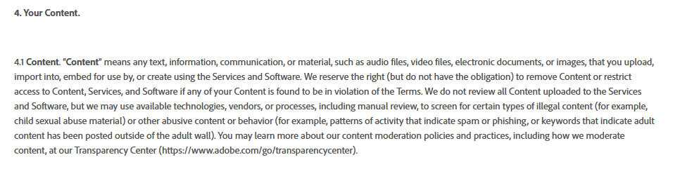 Các điều khoản sử dụng định nghĩa “nội dung” là bất kỳ tác phẩm sáng tạo nào, bao gồm các tệp âm thanh, video, tài liệu điện tử và hình ảnh mà người dùng tải lên, nhập hoặc tạo trong phần mềm.