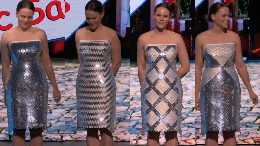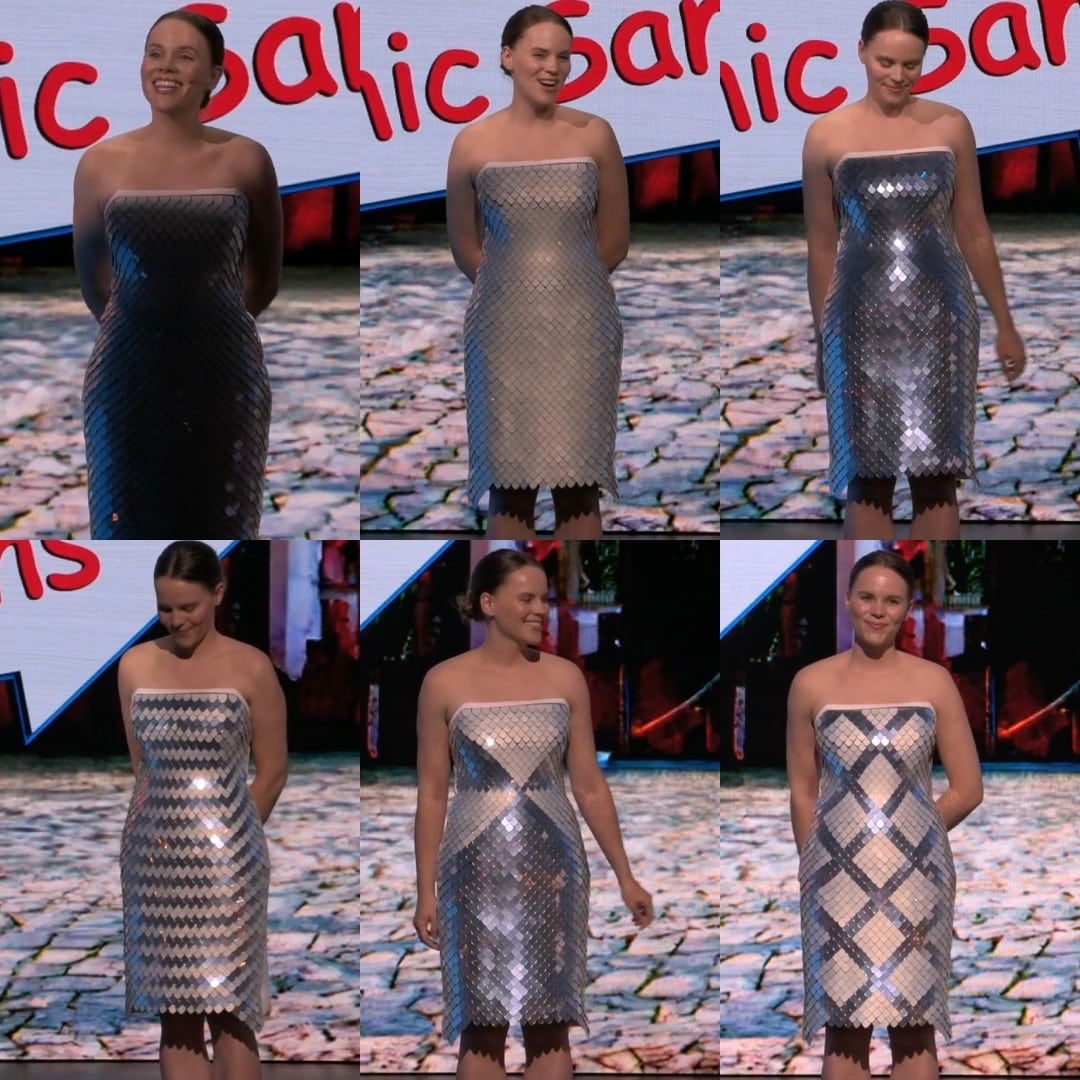 Chỉ với một nút bấm, Dierk đã “thay” đến bốn bộ váy khác nhau trong nháy mắt mà không cần phải đi vào cánh gà. Ấn tượng hơn, loại vải mô-đun đặc biệt này còn được gắn các cảm biến phản ứng với chuyển động, nên mỗi khi Dierk xoay người từ bên này sang bên kia, các thiết kế nhấp nhô quét qua các vảy trên bề mặt trang phục.