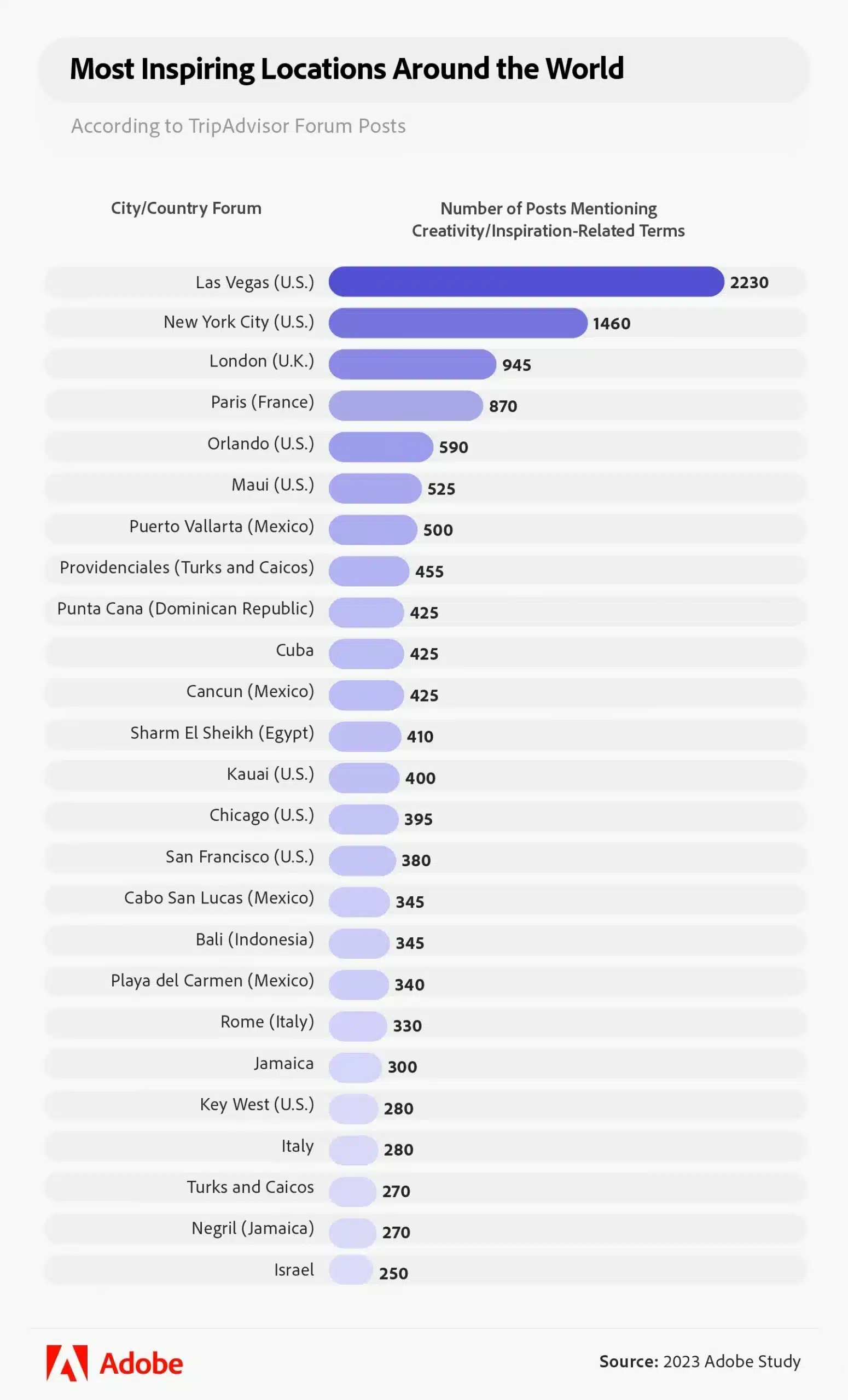 Mới đây, gã khổng lồ công nghệ sáng tạo Adobe đã cho phát hành một nghiên cứu tận dụng các dữ liệu từ nền tảng Yelp và TripAdvisor, cũng như insights từ hơn 1000 người làm sáng tạo trên khắp thế giới để tiết lộ những nơi được cho là truyền cảm hứng nhất.