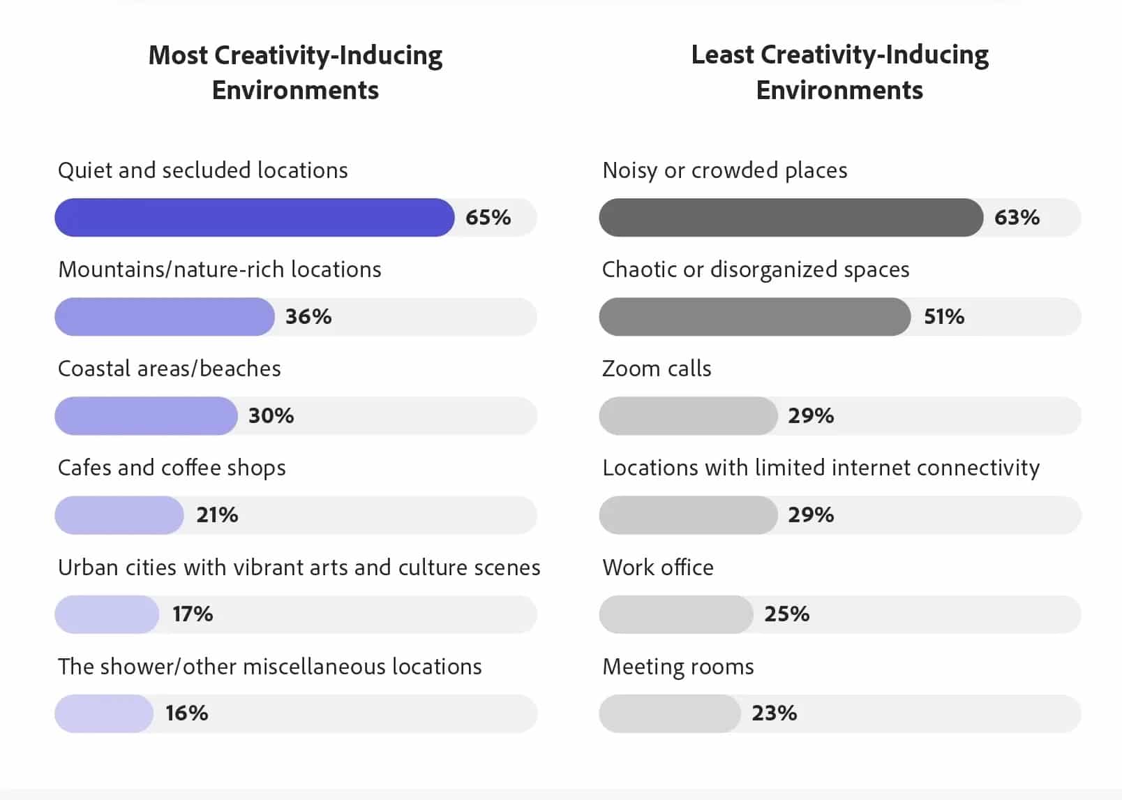 Bên cạnh đó, 23% số người được khảo sát cho rằng các phòng họp, văn phòng hay cuộc gọi Zoom là những môi trường làm giảm khả năng sáng tạo. Những nơi có nhiều yếu tố thiên nhiên và yên tĩnh được đại đa số công nhận là giúp tăng khả năng sáng tạo.