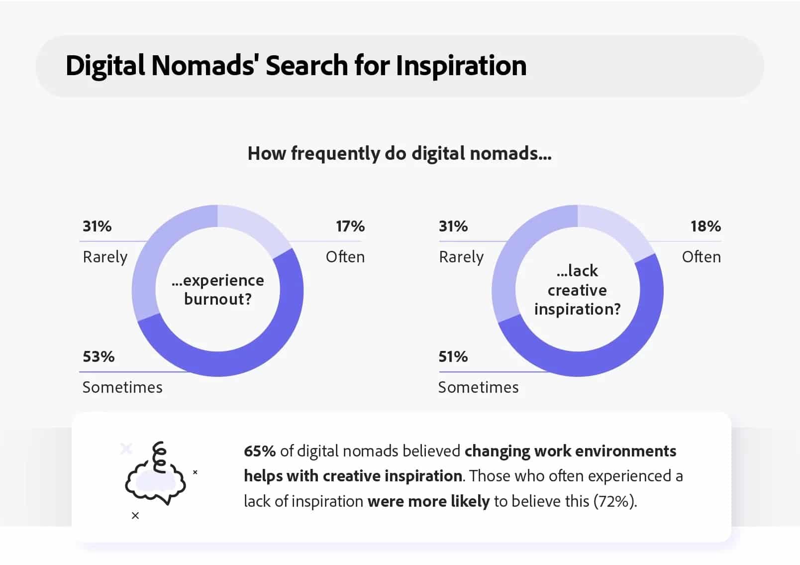 Có 18% người làm sáng tạo thừa nhận thường xuyên gặp phải tình trạng burnout, và 72% trong số họ cho biết việc thay đổi môi trường làm việc có thể giúp khơi dậy lại nguồn năng lượng sáng tạo của mình.