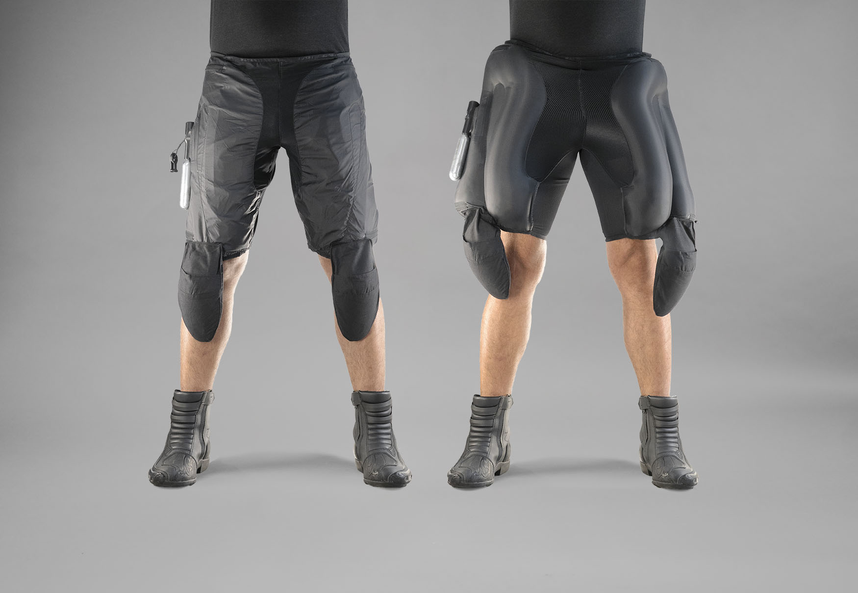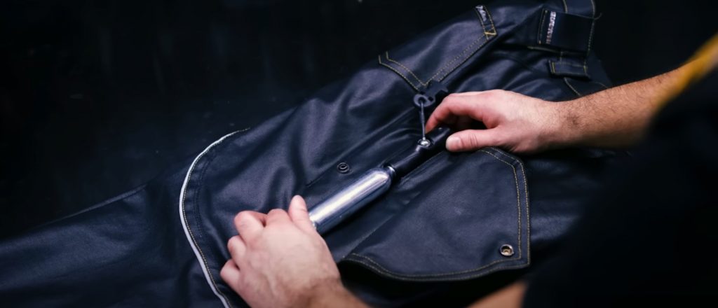 Được đặt tên là Airbag Clothes, bên trong bộ quần áo đặc biệt này là một hộp CO2 có khả năng giải phóng khí gas để làm phồng vải ngay tức khắc khi người lái bị ngã khỏi xe.