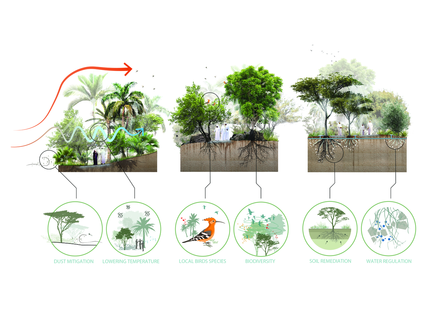 Thiết kế công viên được đưa ra thông qua các nhà sinh vật học của SLA và các nghiên cứu kéo dài của các chuyên gia trồng trọt về thiên nhiên và động vật hoang dã độc đáo của khu vực. Nghiên cứu được xuất bản trong cuốn sách nội bộ về thực vật của SLA bao gồm tất cả các loài thực vật bản địa của UAE, điều kiện sinh trưởng và phát triển tối ưu của chúng cũng như cách tích hợp chúng vào thiết kế.