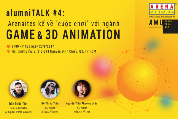 Là những gương mặt trẻ đã có một số thành công nhất định trong lĩnh vực Games & 3D Animation, các bạn cựu học viên Arena: Thiện Tâm, chuyên về mảng Animation trong Games đến từ Digital Works Vietnam; Ái Trân và Phương Uyên, làm khâu Modelling cho phim điện ảnh tại Sparx Virtuos sẽ cung cấp cho các bạn trẻ có ý định dấn thân vào ngành nghề này một bức tranh tổng thể dưới góc nhìn người trong cuộc.
