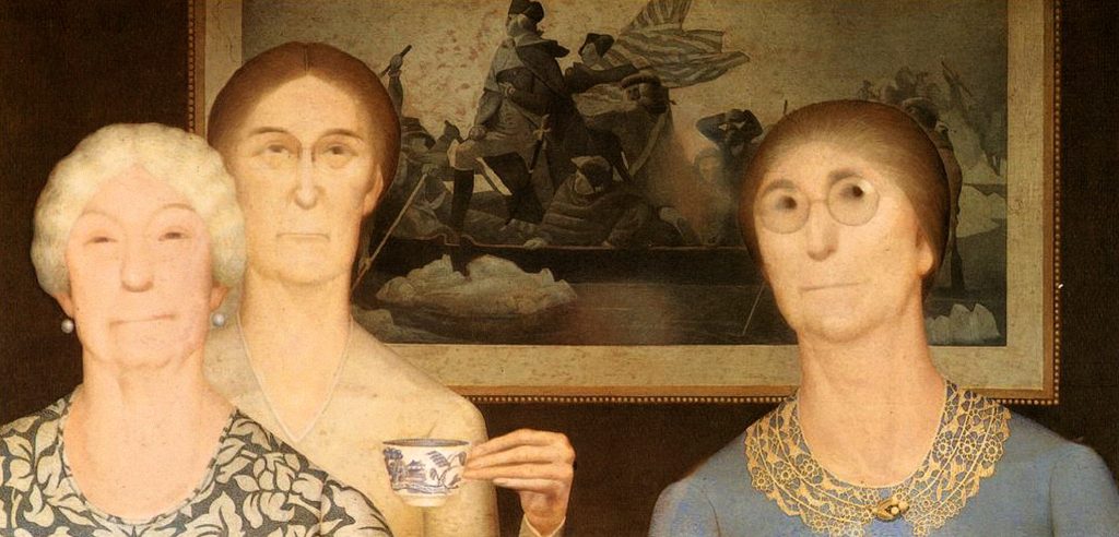 Wood là một người đa nghi. Những ý tưởng lớn khiến ông dè chừng. Bức Con gái của Cách mạng (Daughters of Revolution) đã thể hiện khía cạnh này một cách tuyệt hảo bằng cách phác họa ba bà lão đứng trước bức tranh Washington băng qua Delaware (Washington Crossing the Delaware) đậm tính biểu tượng của Leutze. Họ tự phụ và nghiêm trang. Ý tưởng lớn của họ — xuất phát từ những nhân vật trong Chiến tranh Cách mạng Mỹ, có trí tuệ, sự tinh tế và tầm vóc đặc biệt — là một trò đùa, nhẹ nhàng như một thúc sườn nhắc nhở. Bức tranh được thiết kế đẹp mắt, với những đường vân và gợn sóng nhẹ nhàng. Những người phụ nữ đầy lòng tự trọng nhưng cũng rất nghiêm túc và bộc trực. Họ cũng luôn mềm mỏng và nhường nhịn,như hầu hết những người bà của chúng ta; họ không có chút nào tàn ác. Bởi ngay cả những cuộc cách mạng cũng cần những con người gìn giữ các tiêu chuẩn đời thường.