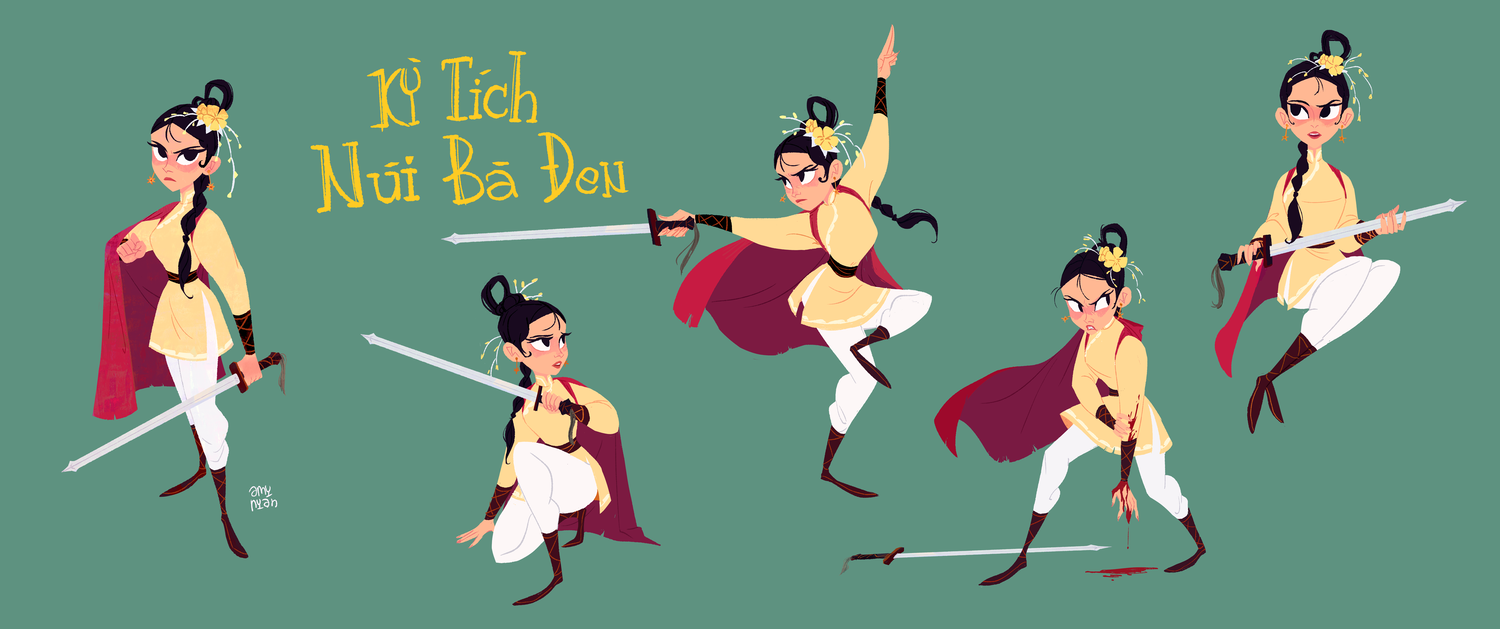 Hay dự án Kỳ tích núi Bà Đen lấy cảm hứng từ vai diễn của mẹ cô những năm 90. Đây là vai diễn đầu tiên của mẹ cô, và nó đã truyền cảm hứng cho cô rất nhiều về phim hoạt hình Việt Nam. Thông qua dự án này, cô đã thử nghiệm thiết kế nhân vật nữ hiệp dựa trên vai diễn của mẹ cô. “Mình đã kết hợp trang phục truyền thống Việt Nam với phong cách vẽ phương Tây, vì mình muốn lan truyền nét đẹp của văn hóa Việt Nam đến bạn bè trên toàn thế giới. Mình cũng đã làm dự án về các phù thủy kết hợp với các loài vật khác nhau…”
