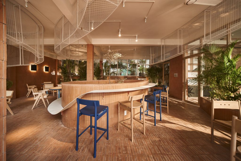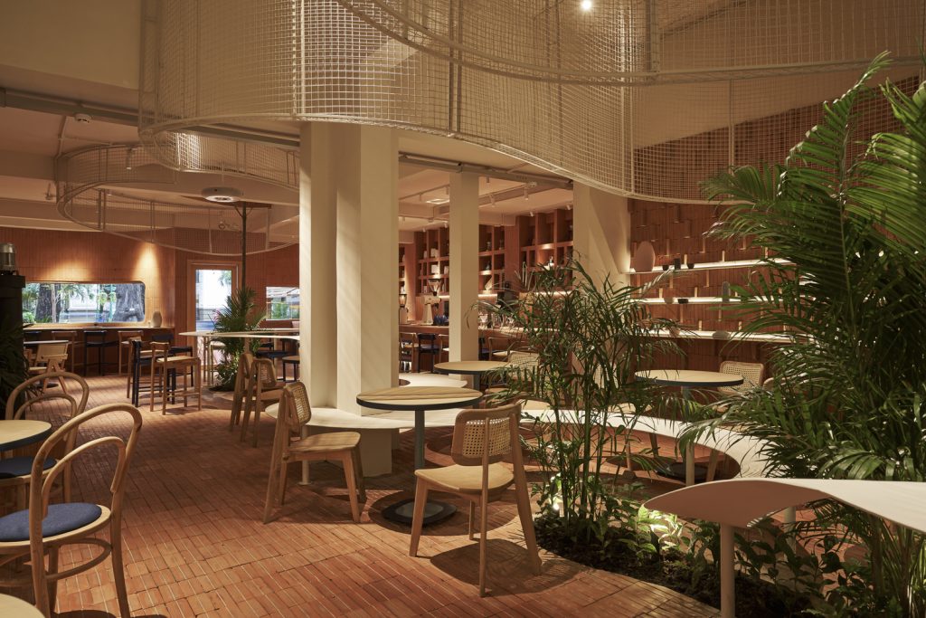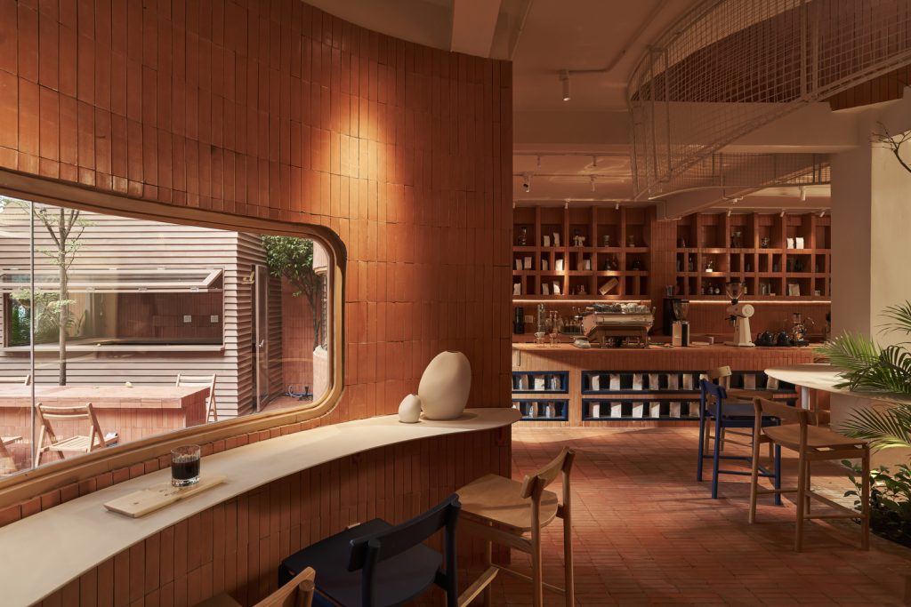 Bằng ngôn ngữ thiết kế và sự kết hợp vật liệu, Red5studio đem chất liệu gạch đất nung đỏ từ mặt tiền vào toàn bộ không gian nội thất – sàn, tường, quầy bar hay cả những khối ghế ngồi. Phần mây được thể hiện bằng hệ khung lưới sắt chạy dài trên trần xuyên suốt cả 2 tầng và mặt tiền. Ngoài ra màu xanh navy – màu sắc đặc trưng của thương hiệu và gỗ màu tự nhiên cũng được nhóm thiết kế khéo léo đưa vào không gian.