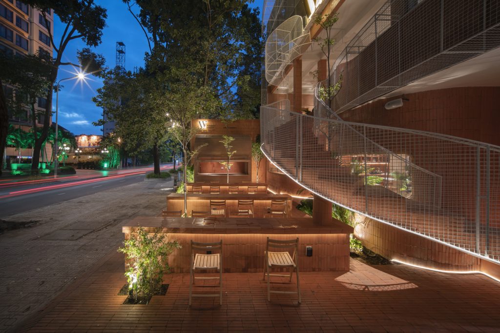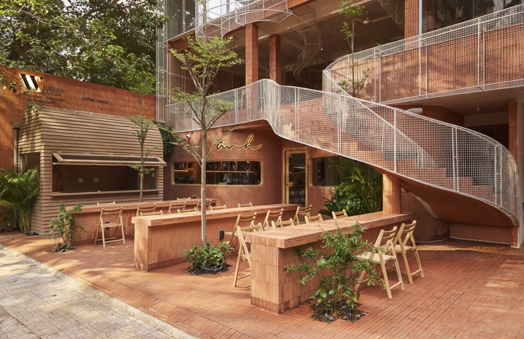 Bằng cách tạo nên một khối nhà “đỏ gạch” cùng với những đường cong nhẹ nhàng của hệ lưới trắng, khó để biết rằng hiện trạng chỉ là một khối văn phòng bằng kính cứng nhắc. Chính sự thay đổi ấn tượng từ màu sắc, hình khối cũng như vật liệu ấy có lẽ đã tạo nên điểm nhấn cho Anh Coffee Roastery chỉ từ ánh nhìn đầu tiên.