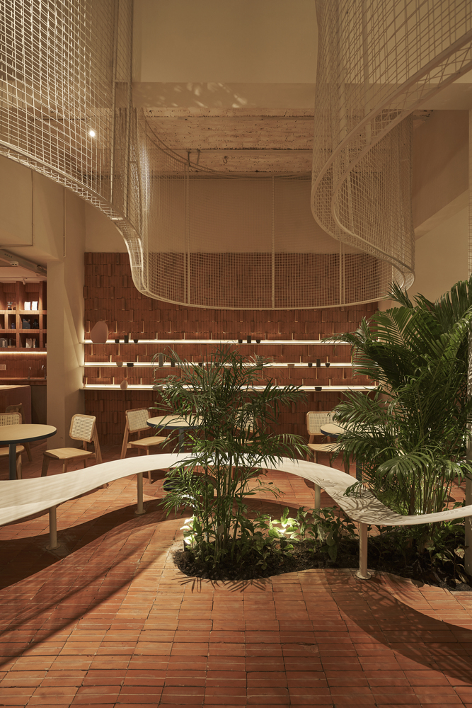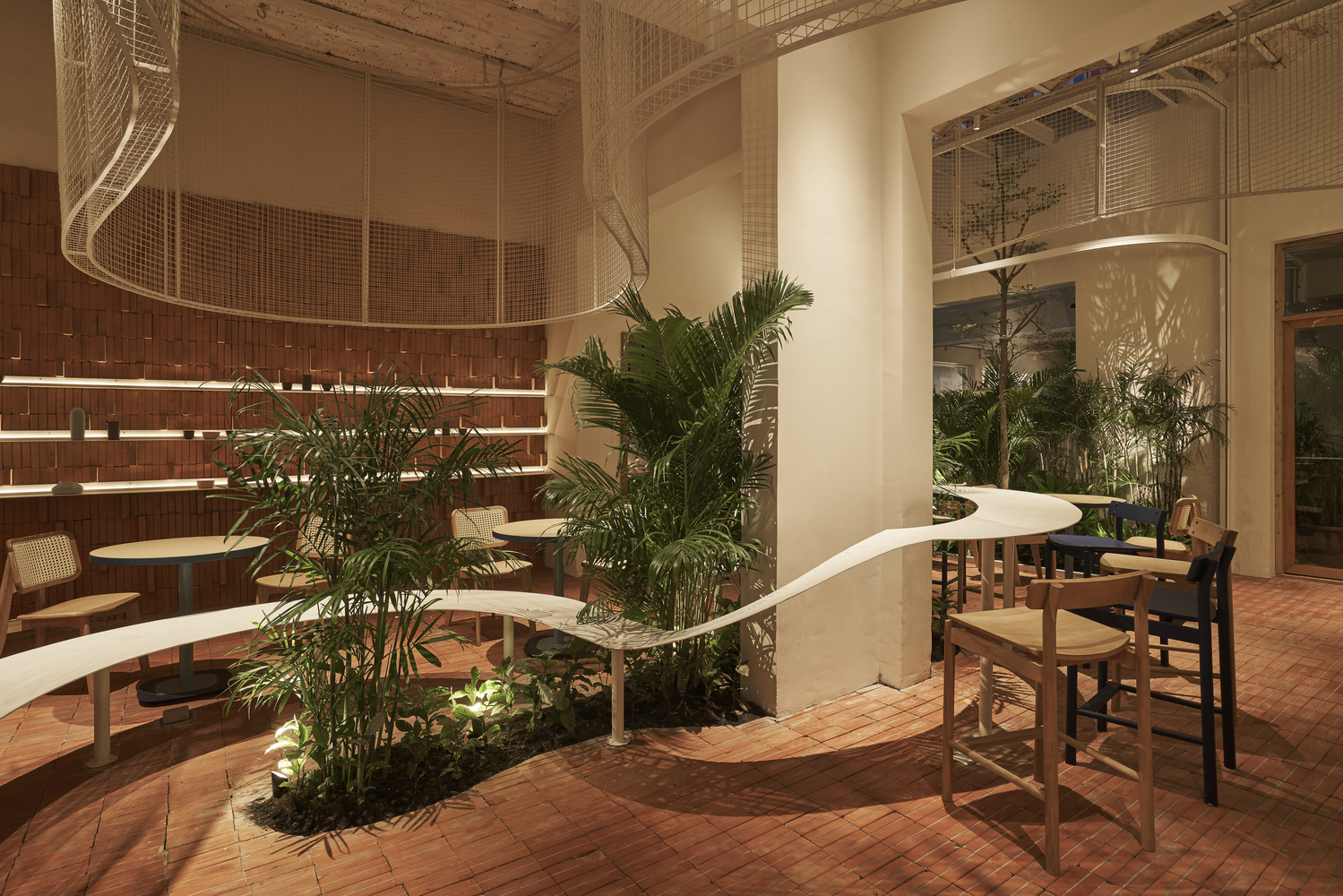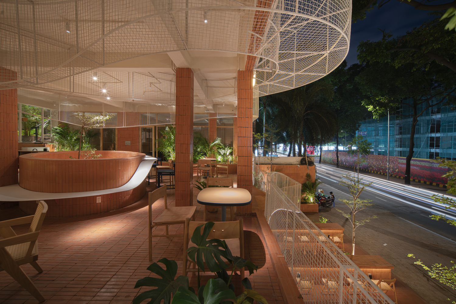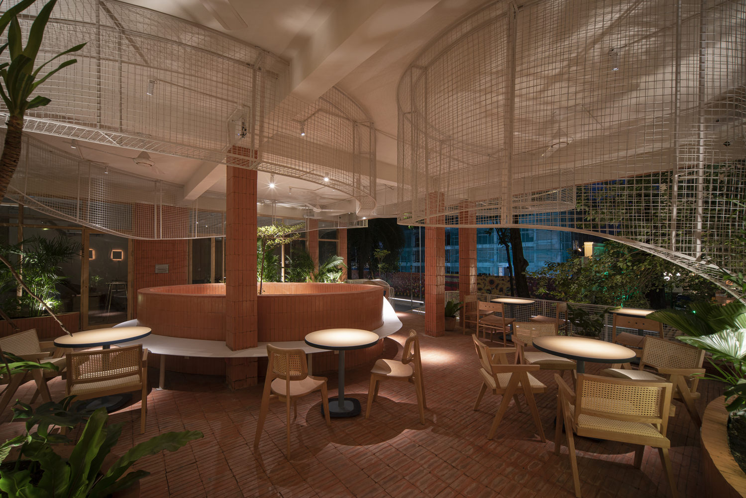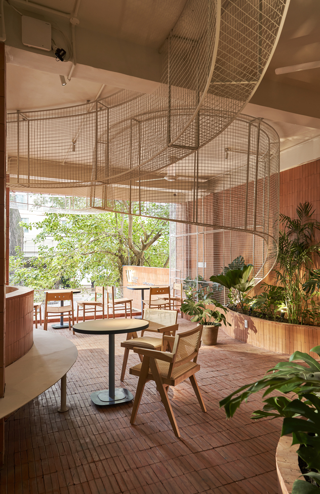 Sự dẫn dắt của những đường cong từ dải bàn chung lớn ở tầng trệt đến khối lưới sắt chạy xuyên suốt công trình, kết hợp cùng những khối gạch đất nung đỏ thẳng thớm, tất cả hòa quyện vào nhau tạo nên một khung cảnh phiêu bồng.